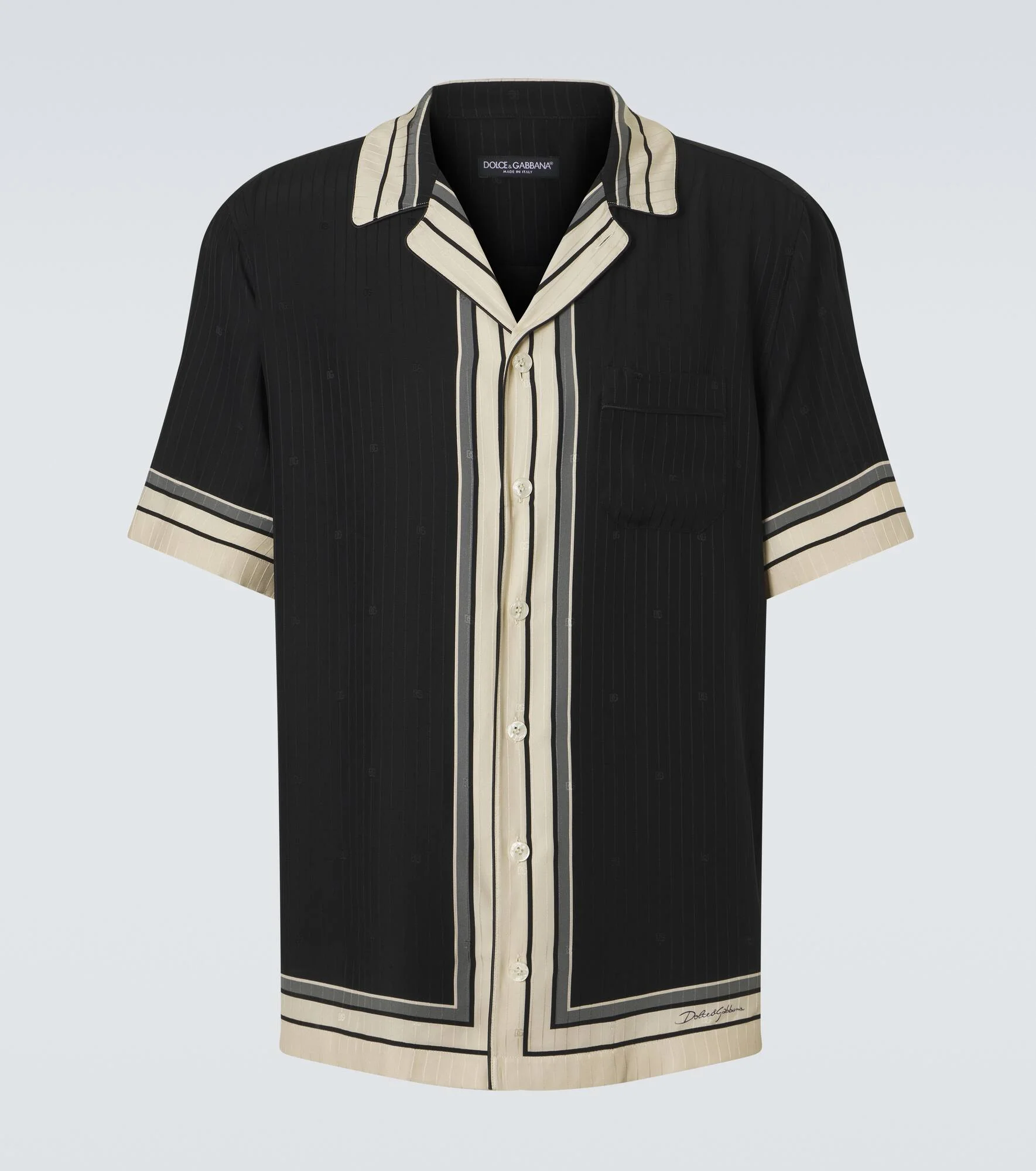 Sicilian culture is on display in Dolce&Gabbana's aesthetic, with bold styles inspired by the brand's Italian heritage. This bowling shirt features a silk construction with a striped motif and subtle DG logos all over. Product Details - Material: 100% silk - Care instructions: dry clean - Made in Italy - Color: black - Designer color name: Righe F.Nero - Closure: buttoned front - Collar: Cuban - Pockets: angled chest pocket - Item number: P01129689 Size & Fit - True to size - With pleats in the back - Designed for a loose fit - Non-stretchy fabric - Falls below the hip - Height of model is 189cm-74.5" and wears a size 41