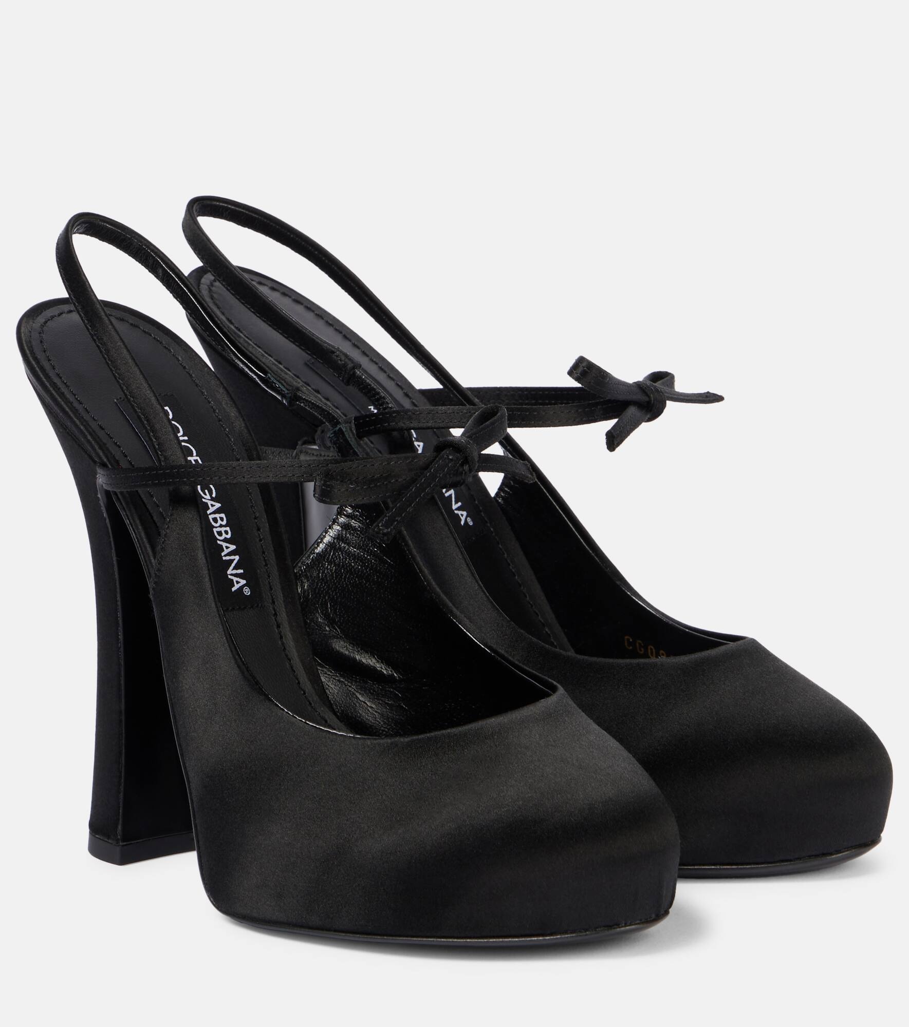 Sicilian culture is at the heart of Dolce&Gabbana's aesthetic, which attributes most of its bold styles to its Italian heritage. These pumps are a slingback pair set atop sky-high platforms and complete with a bow-detail on the straps. Product Details - Upper: fabric - Lining: fabric - Sole: leather insole and sole - Toe shape: almond toe - Made in Italy - Includes: dust bags - Designer color name: Nero/Nero - Item color: black - Closure: ankle strap - Hardware color: gold - Item number: P01027788 Size & Fit - True to size - Narrow - European sizes - 14cm-5.5" heel (size EU 38) - 3,5cm-1.5" platform (size EU 38)