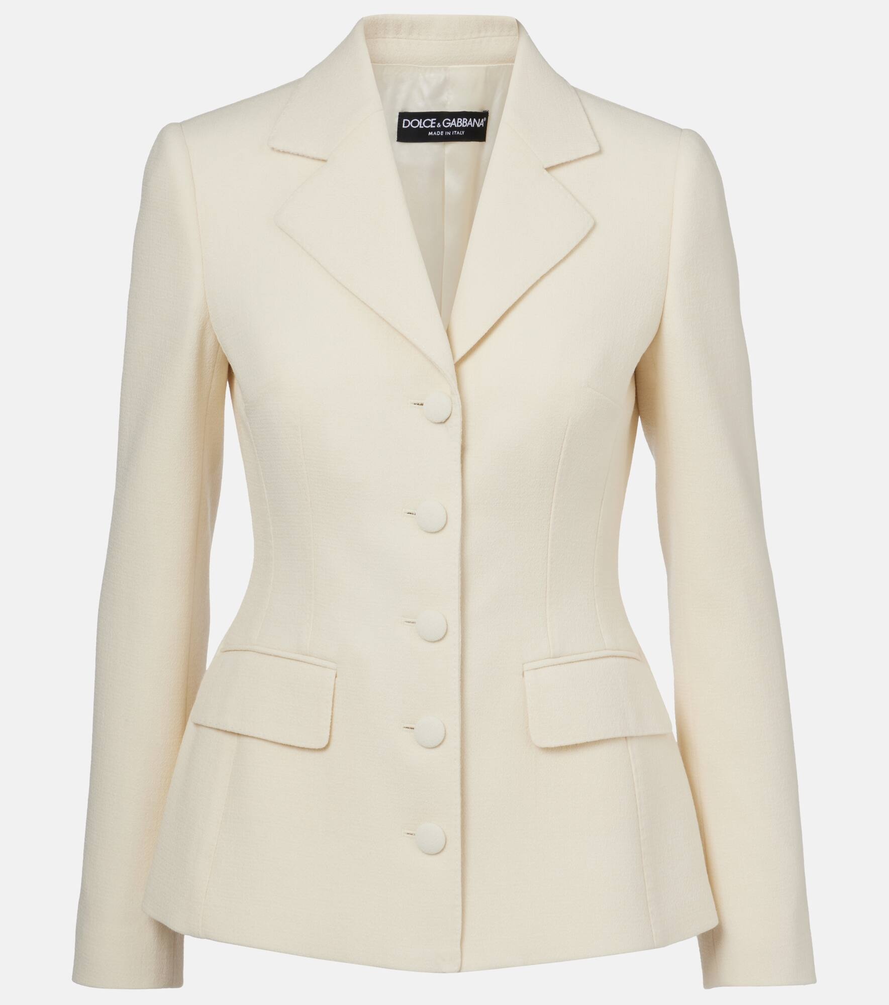 Sicilian culture is at the heart of Dolce&Gabbana's aesthetic, which attributes most of its bold styles to its Italian heritage. This single-breasted blazer is crafted from virgin wool and features notched lapels and flap pockets. Product Details - Material: 100% virgin wool - Care instructions: dry clean - Made in Italy - Designer color name: Bianco Panna Chiaris - Item color: white, ivory - Lining: 92% silk, 8% elastane - Contains non-textile parts of animal origin - Blazer - Closure: single-breasted - Pockets: flap pockets - Notched lapel - Item number: P01040865 Size & Fit - Fits large to size - we recommend trying one size smaller - Shoulder pad inserts - Cinched waist - Non-stretchy fabric - Falls below the hip - The model seen in the picture is 178cm-5'10" and wearing a size IT 38