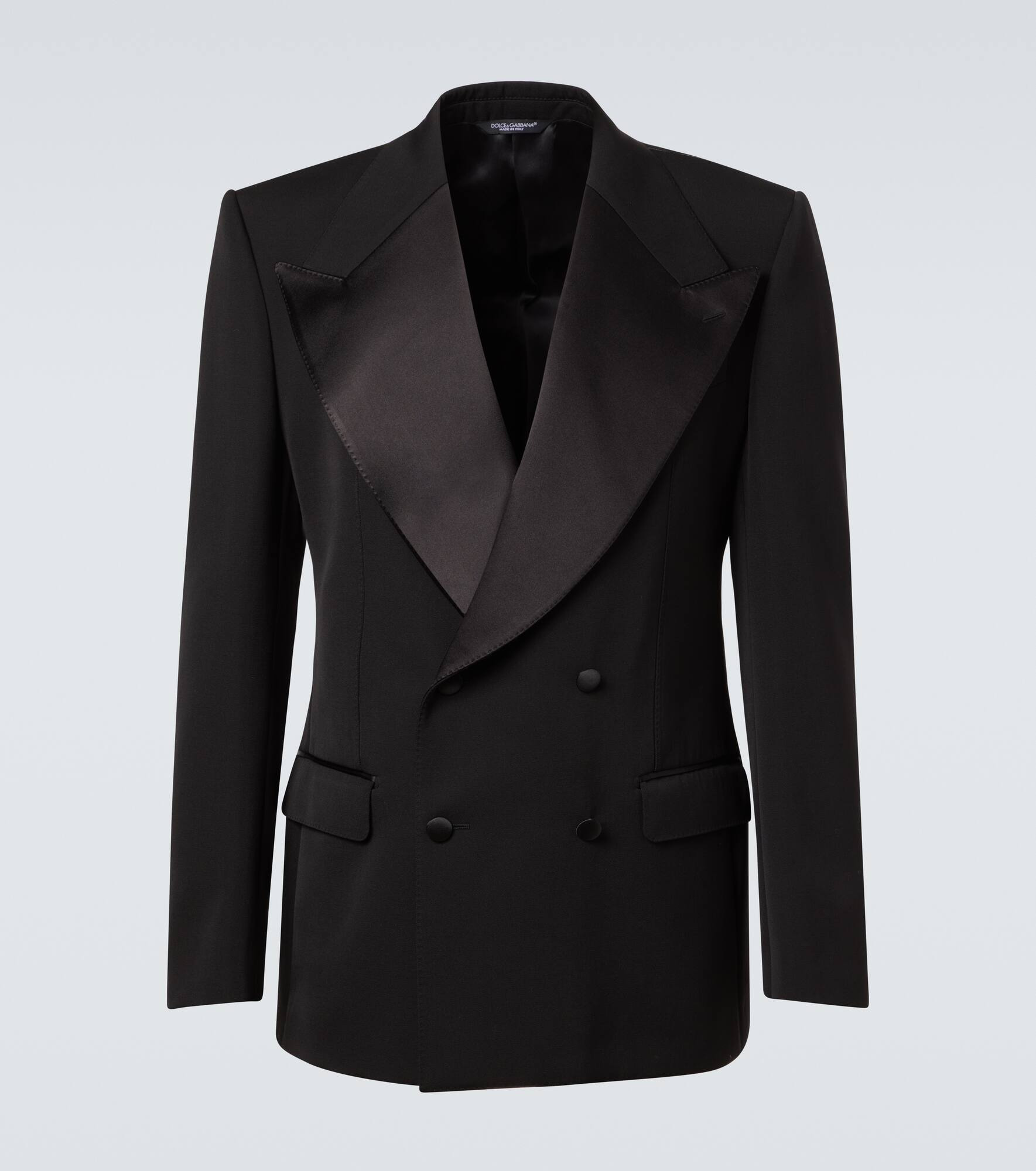Dolce&Gabbana's applies time-honored techniques to every tailored piece, blending traditional elegance with modern style. This sophisticated tuxedo jacket is crafted from a wool and silk-blend, finished with classic silk satin peak lapels. Product Details - Material: 85% wool, 12% silk, 3% polyester - Care instructions: dry clean - Made in Italy - Designer color name: Black - Item color: black - Lining: 100% silk - Peak lapel - Pockets: breast pocket, flap pockets, internal pockets - Cuff: four buttons - Closure: double-breasted (four buttons) - Vent: double - Item number: P01049958 Size & Fit - True to size - Shoulder pad inserts - Slim fit - Non-stretchy fabric - Falls below the hip - The model in the picture is 185cm-6'1" and wearing a size IT 50