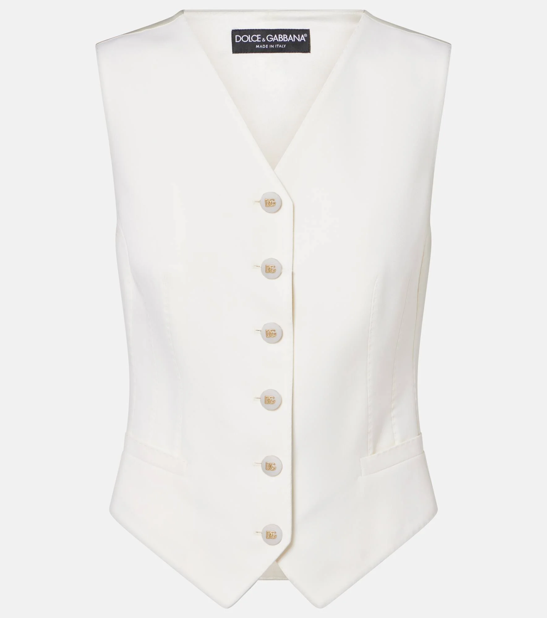 Sicilian culture is on display in Dolce&Gabbana's aesthetic, with bold styles inspired by the brand's Italian heritage. Made from a wool and silk blend, this vest is finished with DG-detailed buttons at the front. Product Details - Material: 80% wool, 15% silk, 5% elastane - Care instructions: dry clean - Made in Italy - Color: white - Designer color name: Bianco Naturale - Lining: 92% silk, 8% elastane - Hardware color: gold - Pockets: faux pockets - Closure: buttoned front - Item number: P01122871 Size & Fit - True to size - Cinched waist - Non-stretchy fabric - Falls to the hip - The model seen in the picture is 178cm-5'10" and wearing a size IT 40