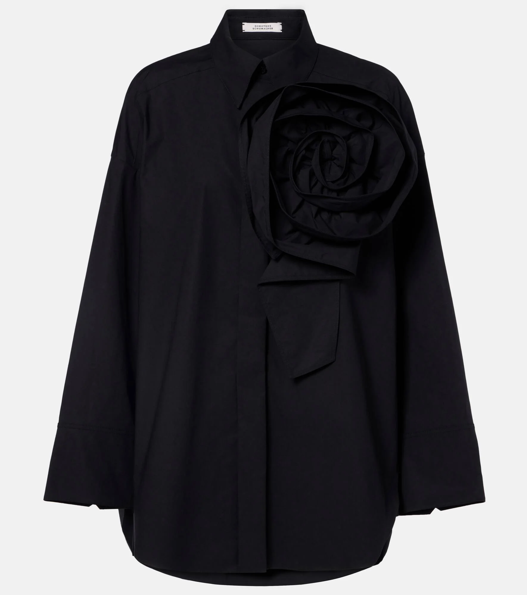 Dorothee Schumacher prefers to keep its designs refined and uncomplicated, allowing your natural confidence to shine through. Crafted from a cotton blend, this oversized shirt stands out with its tonal floral applique on the front. Product Details - Material: 96% cotton, 4% elastane - Care instructions: machine wash at 30 degrees - Made in China - Designer color name: Pure Black - Item color: black - Contains non-textile parts of animal origin - Collar: classic (Straight point) - Closure: concealed buttoned front - Cuff: one button - Hem: rounded - Side slits - Includes: brooch - Item number: P01120036 Size & Fit - True to size - Dropped shoulders - Designed for a loose fit - Non-stretchy fabric - Falls below the hip - The model seen in the picture is 178cm-5'10" and wearing a size 1