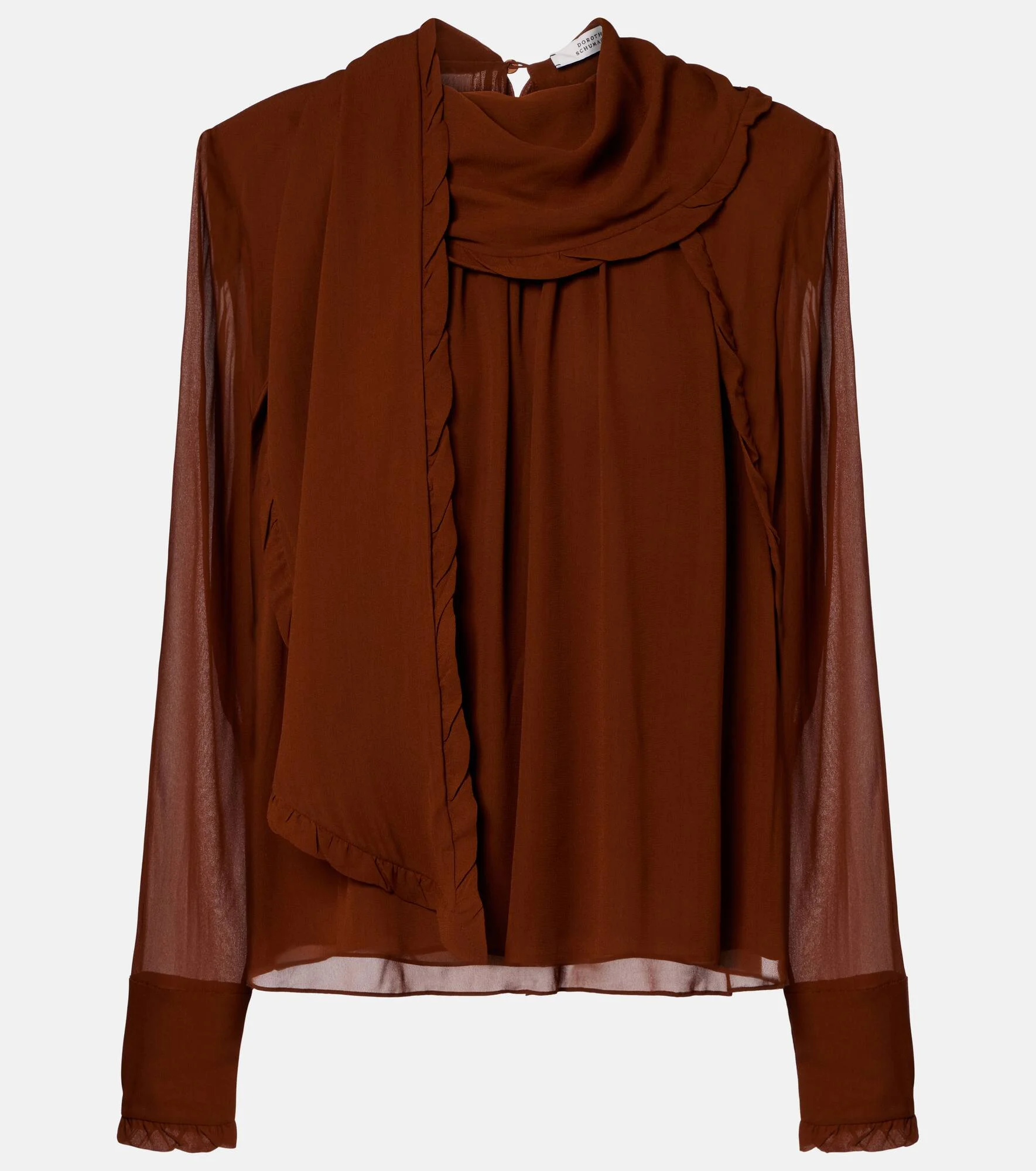Rely on Dorothee Schumacher for refined, uncomplicated styles, like the Sheer Twist blouse. Made from fluid georgette, this design features padded shoulders and an elegant scarf detail. Product Details - Material: 100% viscose - Care instructions: hand wash cold - Made in China - Designer color name: Caramello - Item color: brown - Shoulder pads - Self-tie collar - Contains non-textile parts of animal origin - Item number: P01120054 Size & Fit - True to size - Shoulder pad inserts - Designed for a loose fit - Non-stretchy fabric - Falls to the hip - The model seen in the picture is 178cm-5'10" and wearing a size 1