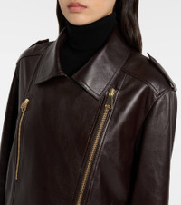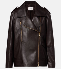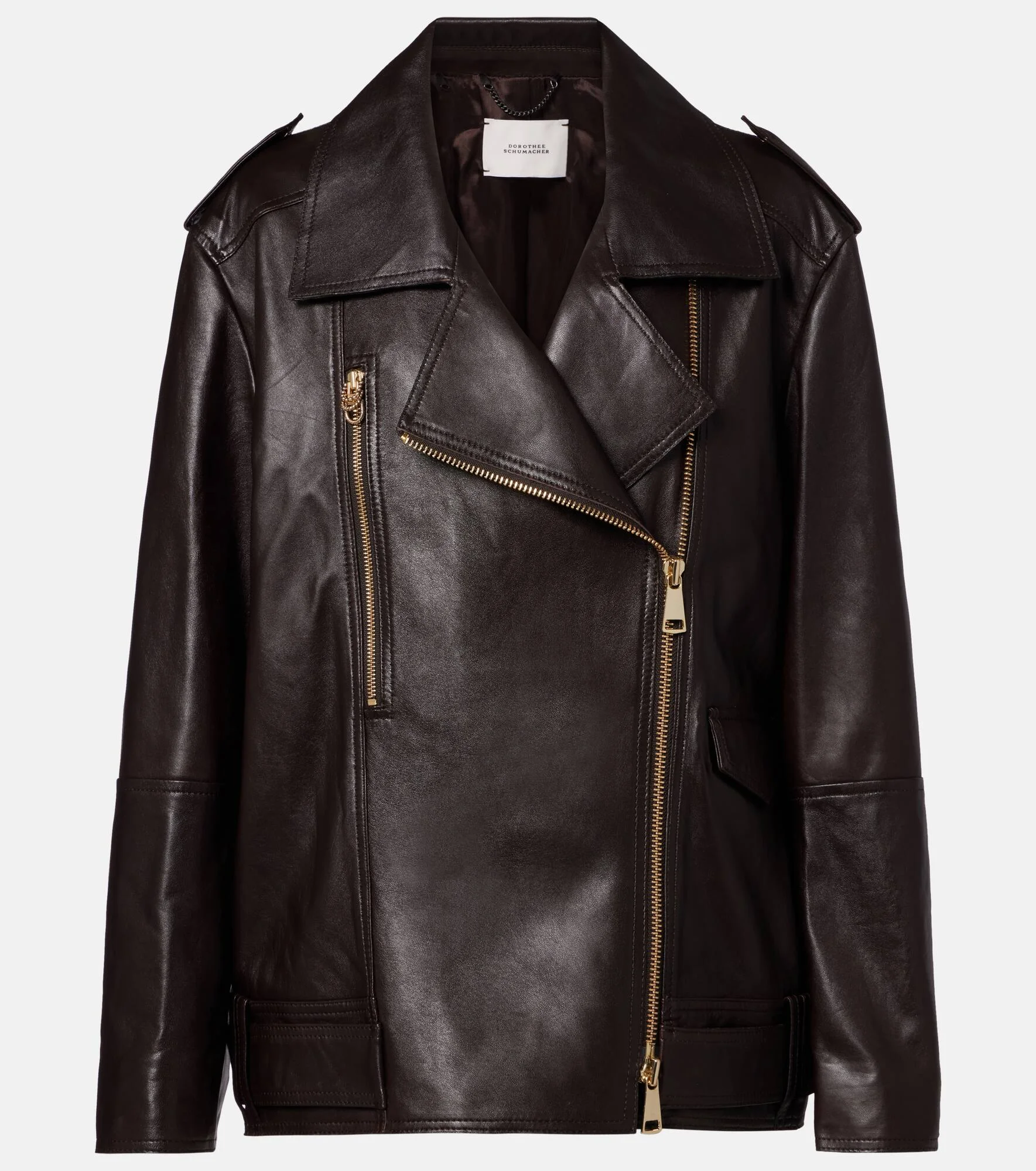 Dorothee Schumacher prefers to keep its designs refined and uncomplicated, allowing your natural confidence to shine through. The Sleek Statement biker jacket is made from supple leather with zipped pockets and adjustable tabs at the waist. Product Details - Material: 100% lamb leather - Care instructions: specialist clean - Made in Turkey - Designer color name: Black Chocolate - Item color: brown - Lining: 100% polyester - Sleeve lining: 100% polyester - Hardware color: gold - Epaulettes - Cuff: zipped - Pockets: zipped pocket, buttoned pocket, internal pocket - Closure: two-way zipped front - Adjustable tabs at the waist - Item number: P01099619 Size & Fit - True to size - Dropped shoulders - Designed for a loose fit - Non-stretchy fabric - Falls below the hip - The model seen in the picture is 178cm-5'10" and wearing a size 1