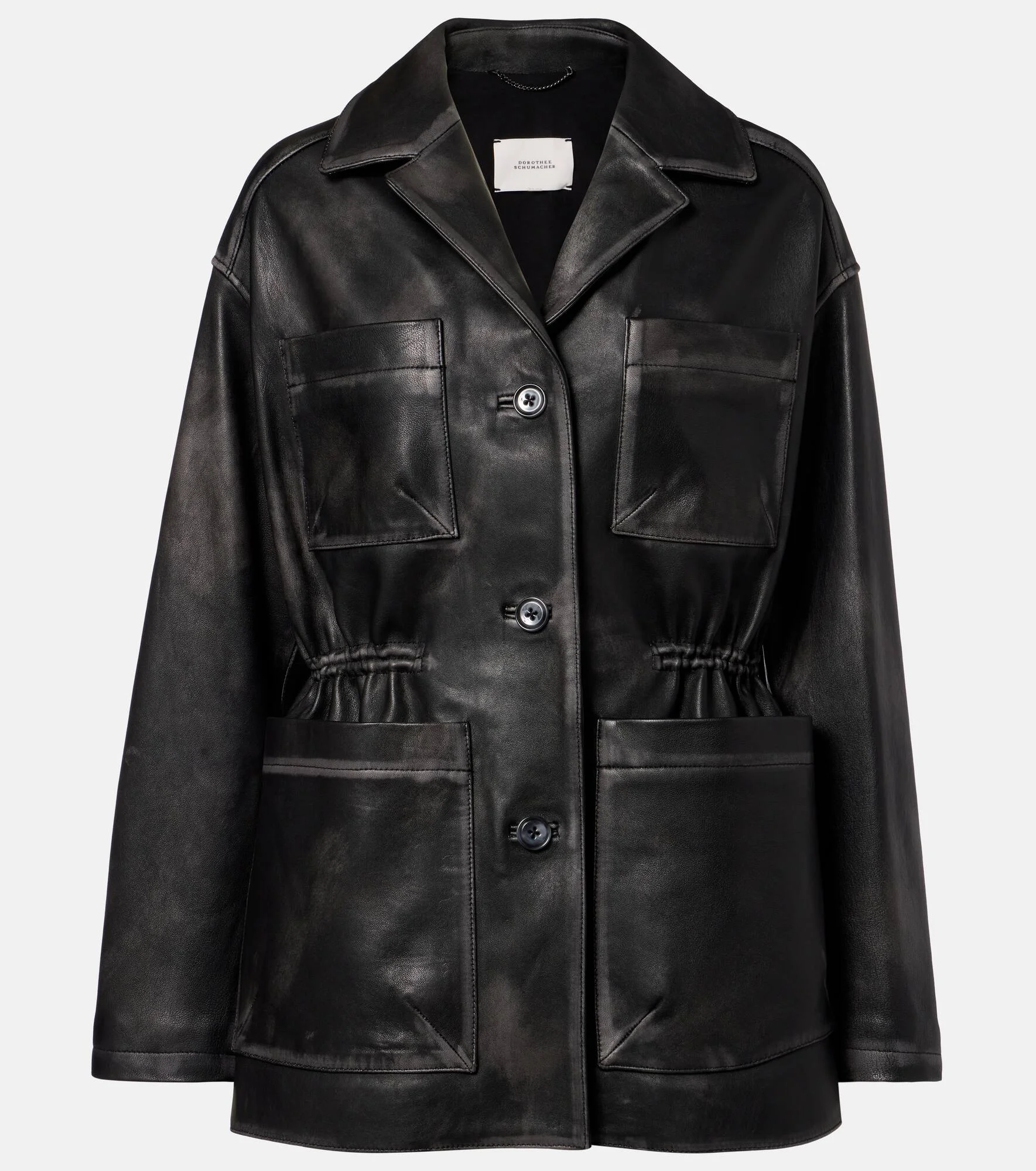 Dorothee Schumacher designs the perfect leather jacket with this oversized vintage style, aptly named Sleek Statement. Crafted from smooth lambskin leather, it features a notched lapel and a drawstring waist. Product Details - Material: 100% lamb leather - Care instructions: specialist clean - Made in Turkey - Color: black - Designer color name: Pure Black - Item color: black - Lining: 100% cotton - Pocket lining: 51% polyester, 49% elastane - Notched lapel - Closure: buttoned front - Pockets: patch pockets, internal pocket - Drawstring waist - Item number: P01120061 Size & Fit - True to size - Dropped shoulders - Loose fit, drawstring waist - Non-stretchy fabric - Falls below the hip - The model seen in the picture is 178cm-5'10" and wearing a size 1