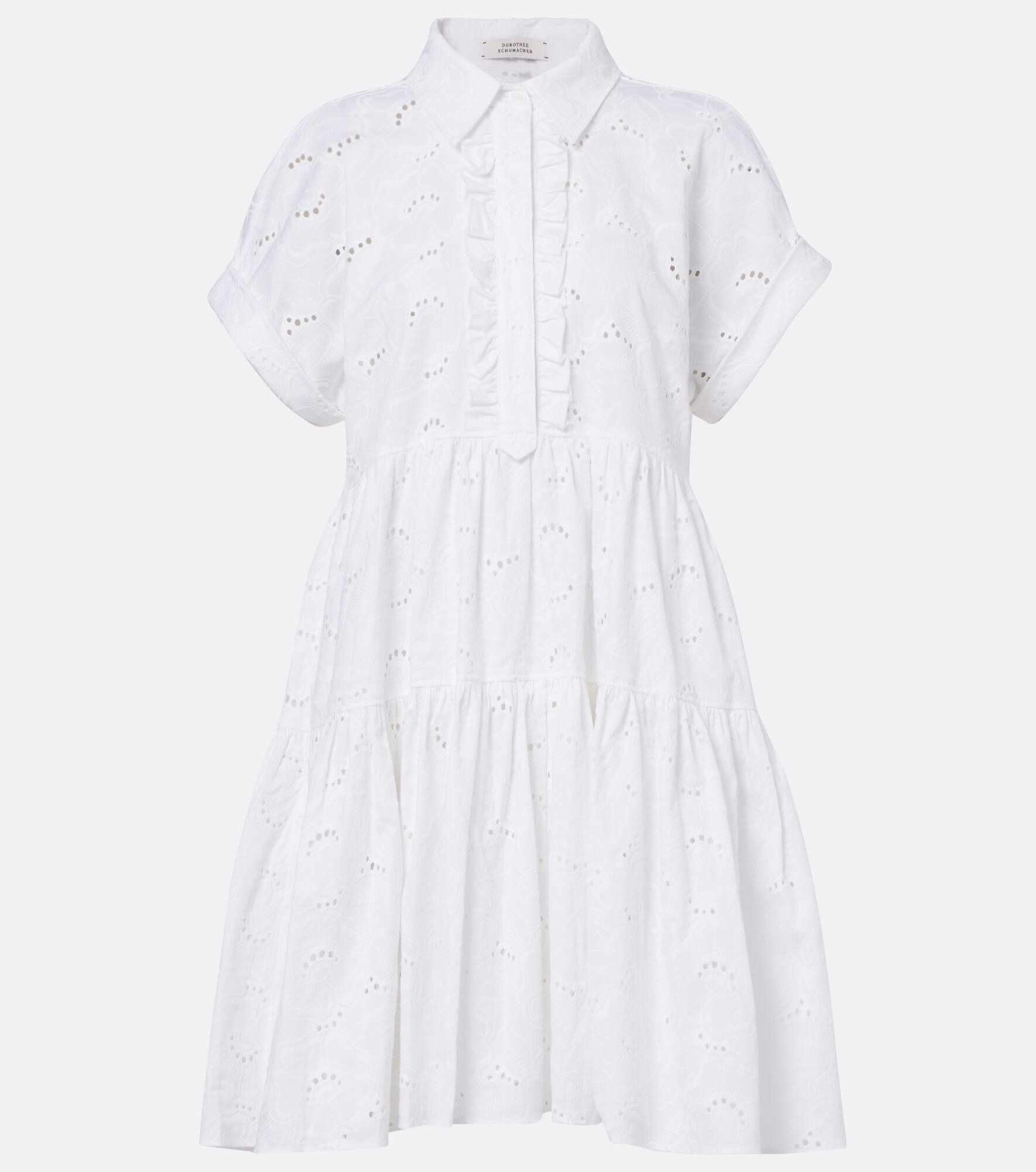 Dorothee Schumacher prefers to keep its designs refined and uncomplicated, allowing your natural confidence to shine through. Shaped with a ruffled, shirting-style neckline, the tiered Summer Blossom minidress is thoughtfully crafted from a broderie anglaise cotton-blend. Product Details - Material: 97% cotton, 3% elastane - Care instructions: machine wash at 30 degrees - Made in China - Designer color name: White - Item color: white - Lining: 100% cotton - Item number: P01046042 Size & Fit - True to size - Cinched waist - Non-stretchy fabric - The model seen in the picture is 178cm-5'10" and wearing a size 1
