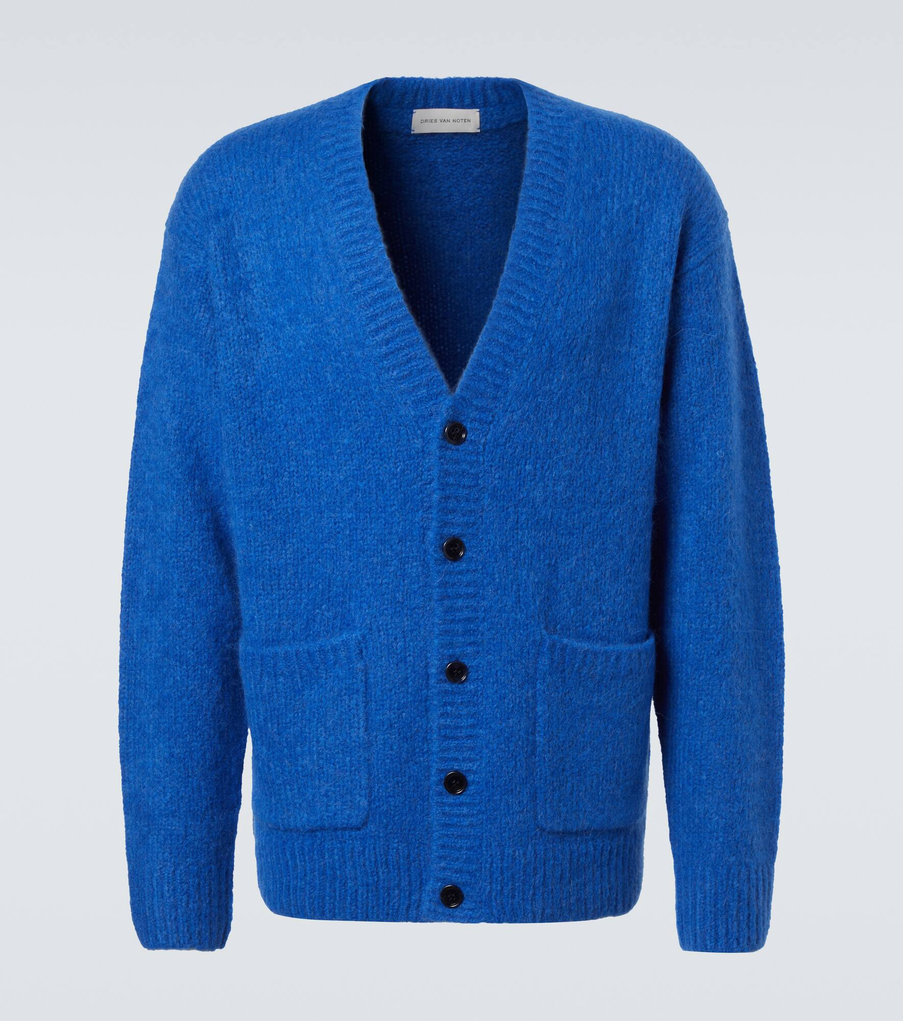 This cardigan from Dries Van Noten is made from a soft alpaca and wool-blend. The design is defined by front patch pockets and ribbed-knit detailing along the neckline, hem and cuffs. Product Details - Material: 60% alpaca wool, 25% wool, 15% polyamide - Care instructions: dry clean - Made in China - Designer color name: Blue - Item color: blue - Collar: V-neck - Closure: buttoned front - Hardware color: black - Pockets: patch pockets - Item number: P01086517 Size & Fit - True to size - Dropped shoulders - Designed for a loose fit - Slightly stretchy fabric - Falls to the hip - Height of model is 188cm-74" and wears a size L