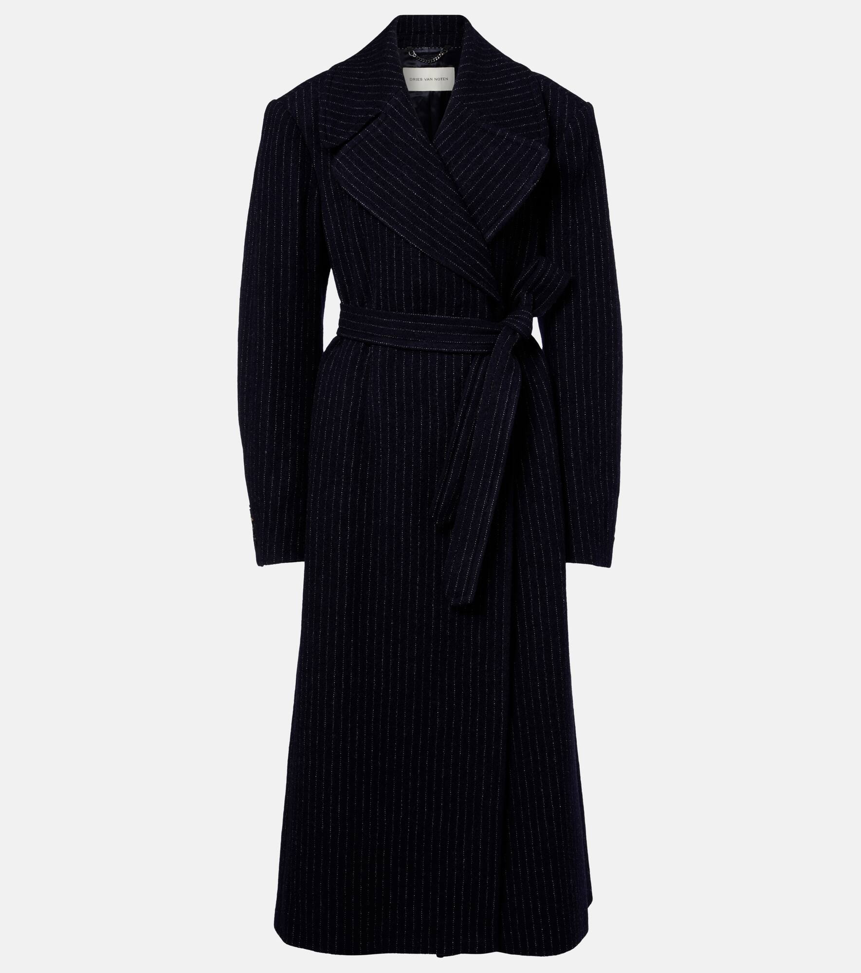 Refine your cold-weather wardrobe with this floor-length Dries Van Noten pinstriped coat. Crafted from wool, the sleek silhouette features structured shoulder pads, peak lapels, side pockets, a self-tie belt, and a concealed zip closure. Product Details - Material: 100% wool - Care instructions: dry clean - Made in Poland - Designer color name: Navy - Item color: blue - Lining: 100% viscose - Closure: concealed zipped front - Self-tie belt - Pockets: internal pocket, side slit pockets - Shoulder pads - Cuff: buttoned - Vent: single - Item number: P01092101 Size & Fit - Fits large to size - we recommend trying one size smaller - Shoulder pad inserts - Loose fit, comes with belt - Non-stretchy fabric - The model seen in the picture is 178cm-5'10" and wearing a size FR 34