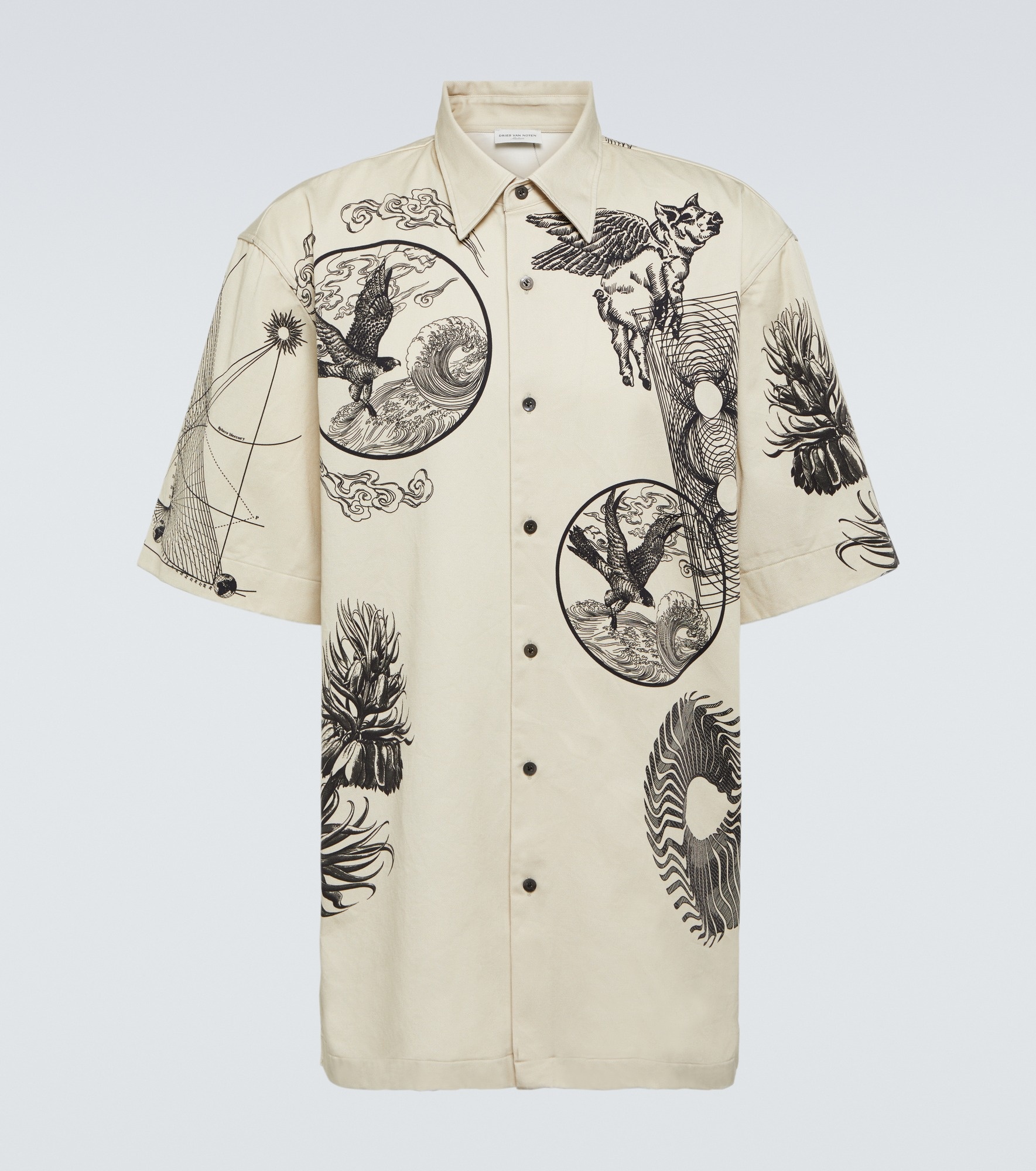 Dries Van Noten's prints are often abstract, overtly maximalist, and always one-of-a-kind. The gray Cassidye shirt has a resort-style fit with a point collar, short sleeves, and a mythological print throughout the longline length. Product Details - Material: 100% cotton - Care instructions: machine wash at 30 degrees - Made in Hungary - Designer color name: Cement - Closure: buttoned front - Item number: P00817911 Size & Fit - True to size - Dropped shoulders - Designed for a loose fit - Mid-weight material - The model in the picture is 185cm-6'1" and wearing a size M