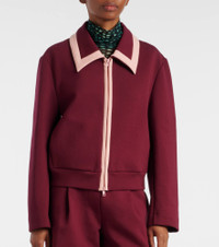 With its sharp tailoring and monochromatic geometries, this jacket from Dries Van Noten nods to the 60s Mod Fashion. Crafted from cotton-blend neoprene, it boasts a boxy cut, contrasting borders, and a cropped silhouette. Product Details - Material: 82% cotton, 12% polyester, 6% elastane - Care instructions: machine wash at 30 degrees - Made in Portugal - Designer color name: Bordeaux - Item color: red, pink - Closure: two-way zipped front - Pockets: side slit pockets - Item number: P01030512 Size & Fit - True to size - Designed for a loose fit - Slightly stretchy fabric - Slightly cropped - The model seen in the picture is 178cm-5'10" and wearing a size XS