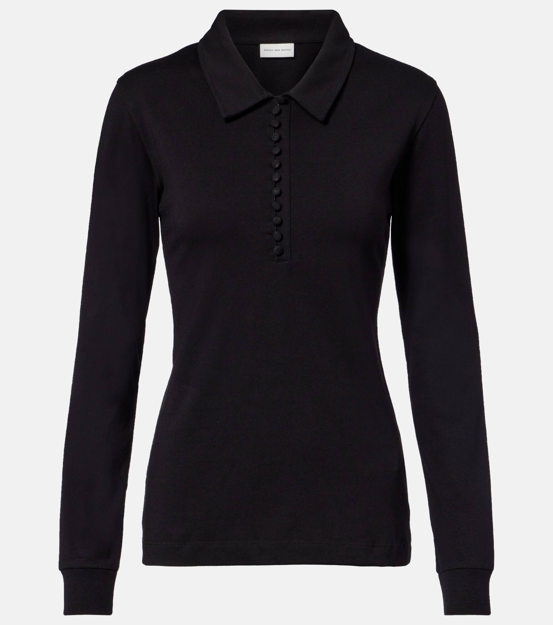 Juxtaposing a poetic sensibility with intelligent tailoring, Dries Van Noten creates styles that are always unique. Crafted from cotton jersey, this elegant polo shirt features long sleeves, ribbed cuffs, and a fabric-covered buttoned closure. Product Details - Material: 100% cotton - Care instructions: machine wash at 30 degrees - Made in Turkey - Designer color name: Black - Item color: black - Collar: classic (Straight point) - Closure: partially buttoned front - Cuff: ribbed - Item number: P01093199 Size & Fit - True to size - Fitted - Slightly stretchy fabric - Falls below the hip - The model seen in the picture is 178cm-5'10" and wearing a size XS