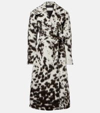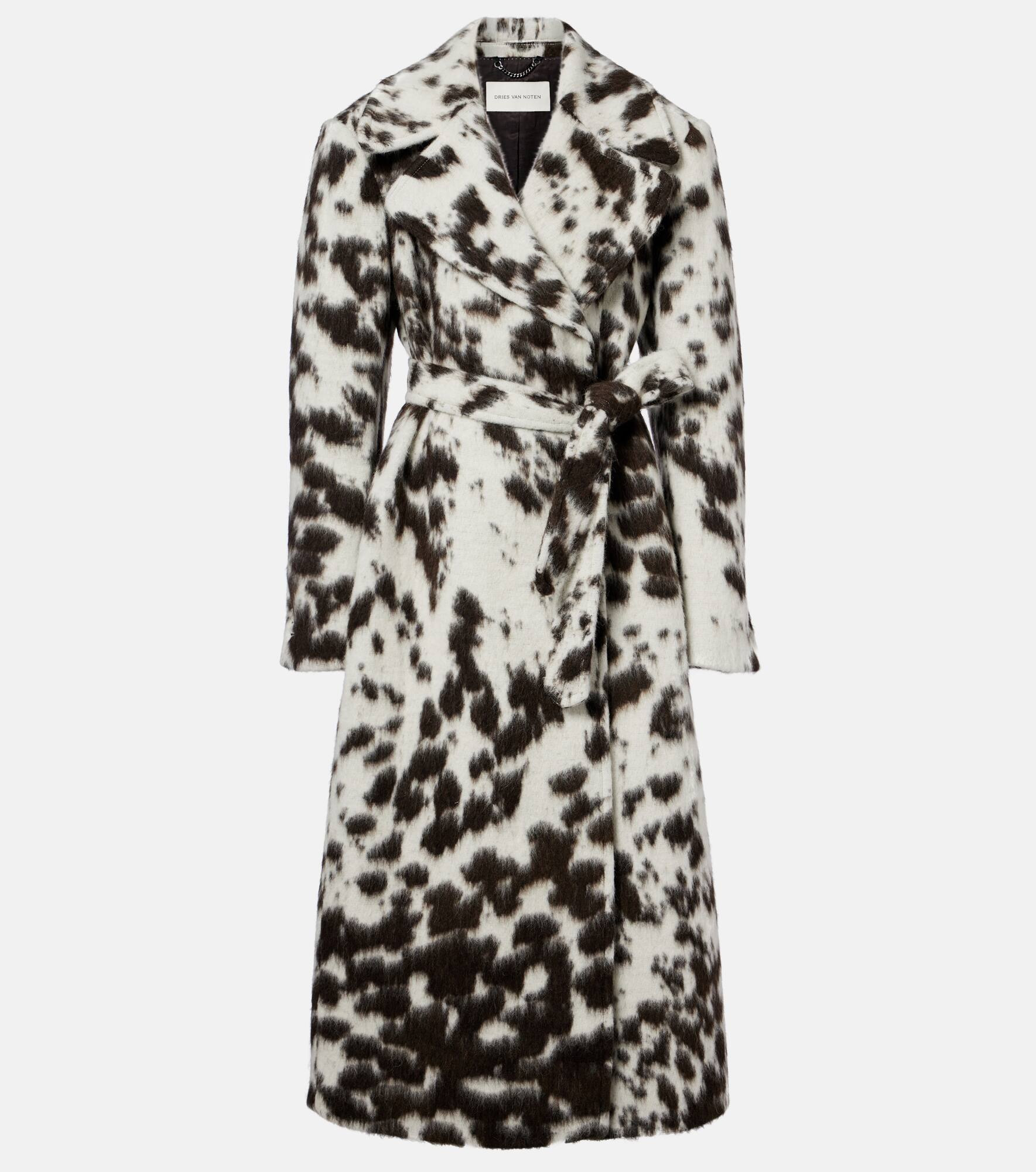 Elevate any cold-season ensemble with this Dries Van Noten coat in a bold cow print. Crafted from a wool and alpaca blend, the design features structured padded shoulders, a self-tie belt, and a concealed front button closure. Product Details - Material: 51% wool, 19% polyester, 15% acrylic, 12% alpaca wool, 3% polyamide - Care instructions: dry clean - Made in Poland - Designer color name: Brown - Item color: white, brown - Lining: 55% cotton, 45% viscose - Closure: concealed buttoned front - Shoulder pads - Pockets: side slit pockets, internal pocket - Self-tie belt - Cuff: buttoned - Vent: single - Item number: P01092102 Size & Fit - Fits large to size - we recommend trying one size smaller - Shoulder pad inserts - Loose fit, comes with belt - Non-stretchy fabric - The model seen in the picture is 178cm-5'10" and wearing a size FR 34