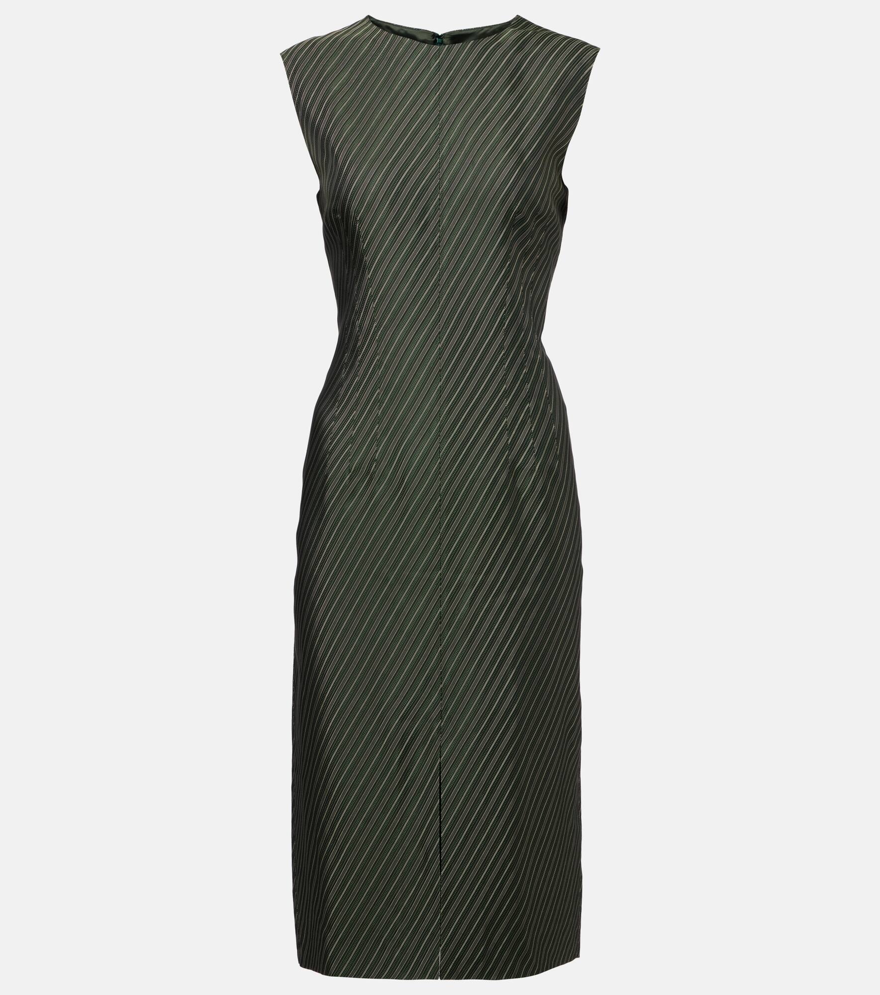 The Delina midi dress from Dries Van Noten offers a sleek, sharp design with darts at the waist for a subtle cinching effect. A front slit adds fluidity and movement. Product Details - Material: 54% viscose, 46% acetate - Care instructions: dry clean - Made in Poland - Designer color name: Bottle - Item color: green - Closure: zipped back - Lining: 100% viscose - Item number: P01030503 Size & Fit - Fits large to size - we recommend trying one size smaller - Cinched waist - Non-stretchy fabric - slit length 25cm-10" - The model seen in the picture is 178cm-5'10" and wearing a size FR 34