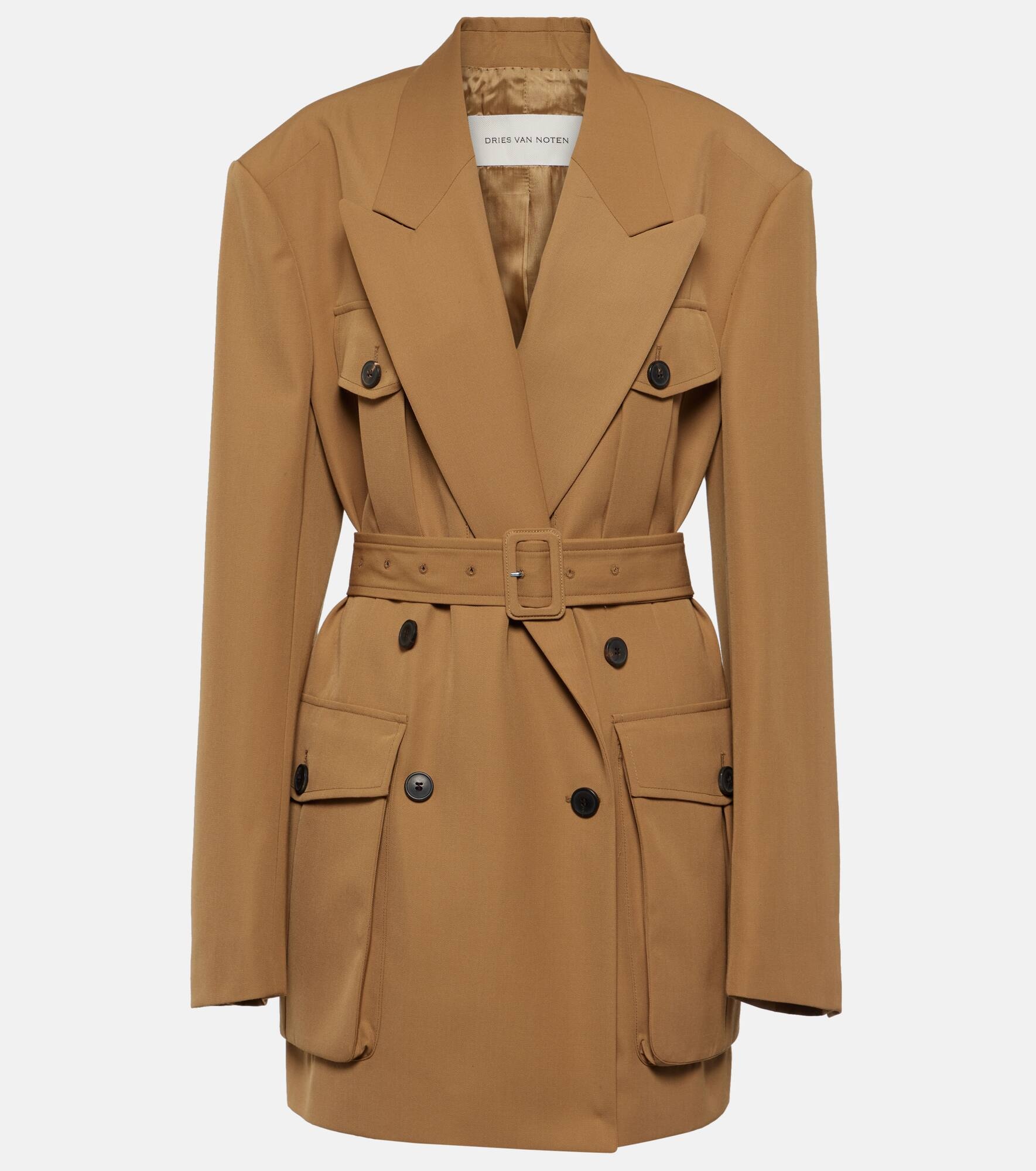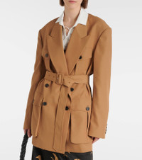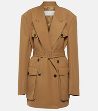 Product Details - Material: 55% polyester, 45% wool - Made in Morocco - Designer color name: Camel - Care instructions: dry clean - Lining: 100% viscose - Closure: double-breasted - Pockets: buttoned pockets, flap pockets - Detachable belt - Item number: P00915620 Size & Fit - Fits large to size - we recommend trying one size smaller - Oversized shoulders - Shoulder pad inserts - Loose fit, comes with belt - Non-stretchy fabric - Falls below the hip - The model seen in the picture is 178cm-5'10" and wearing a size XS