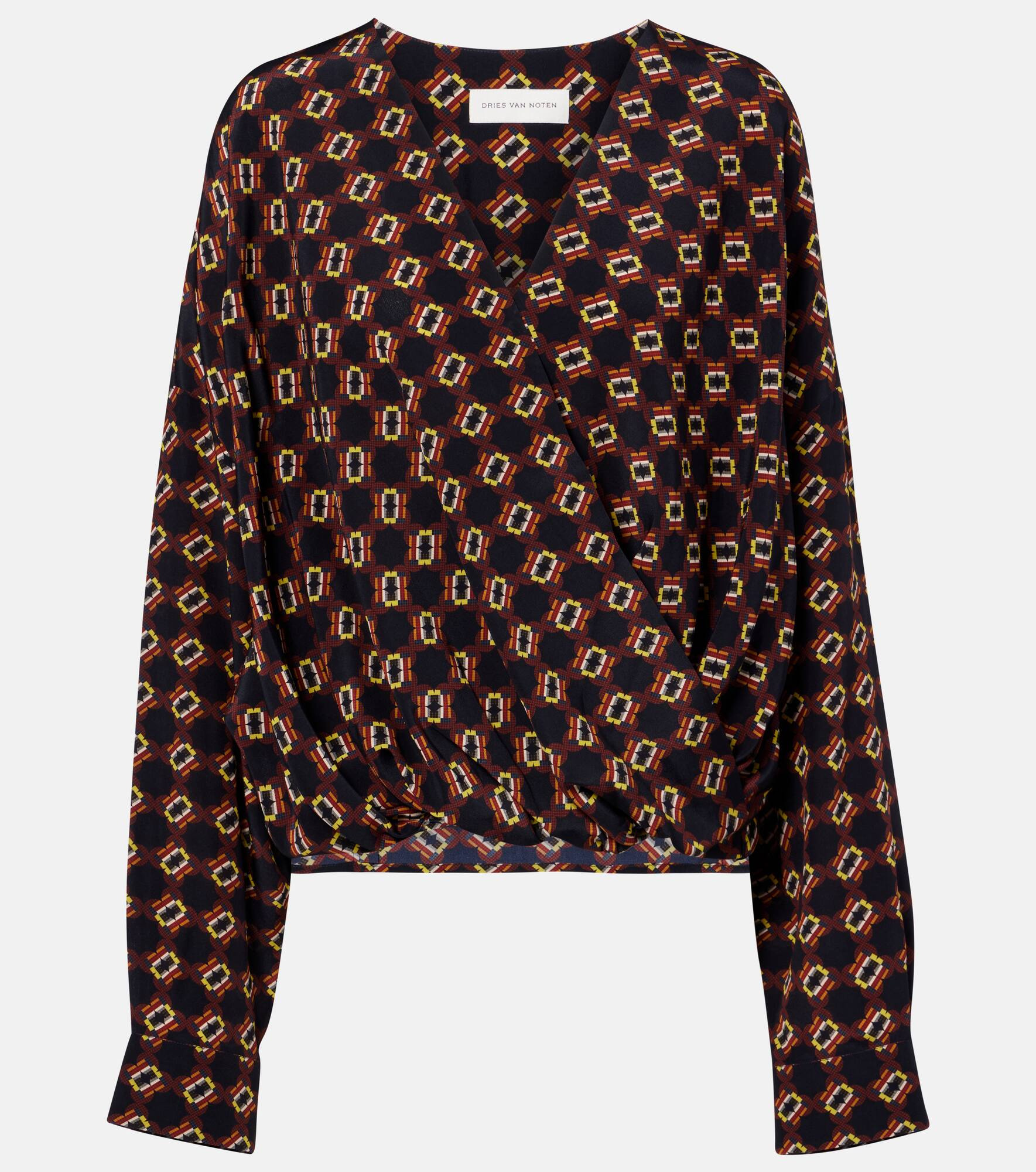 Dries Van Noten's prints are often abstract, overtly maximalist, and always one-of-a-kind. Case in point, this relaxed top is crafted from draped silk and finished with a colorful geometric motif. Product Details - Material: 100% silk - Care instructions: dry clean - Made in Portugal - Designer color name: Navy - Item color: blue, multicolor - Collar: V-neck - Cuff: buttoned - Item number: P01092134 Size & Fit - Fits large to size - we recommend trying one size smaller - Dropped shoulders - Designed for a loose fit - Non-stretchy fabric - Falls below the hip - The model seen in the picture is 178cm-5'10" and wearing a size XS
