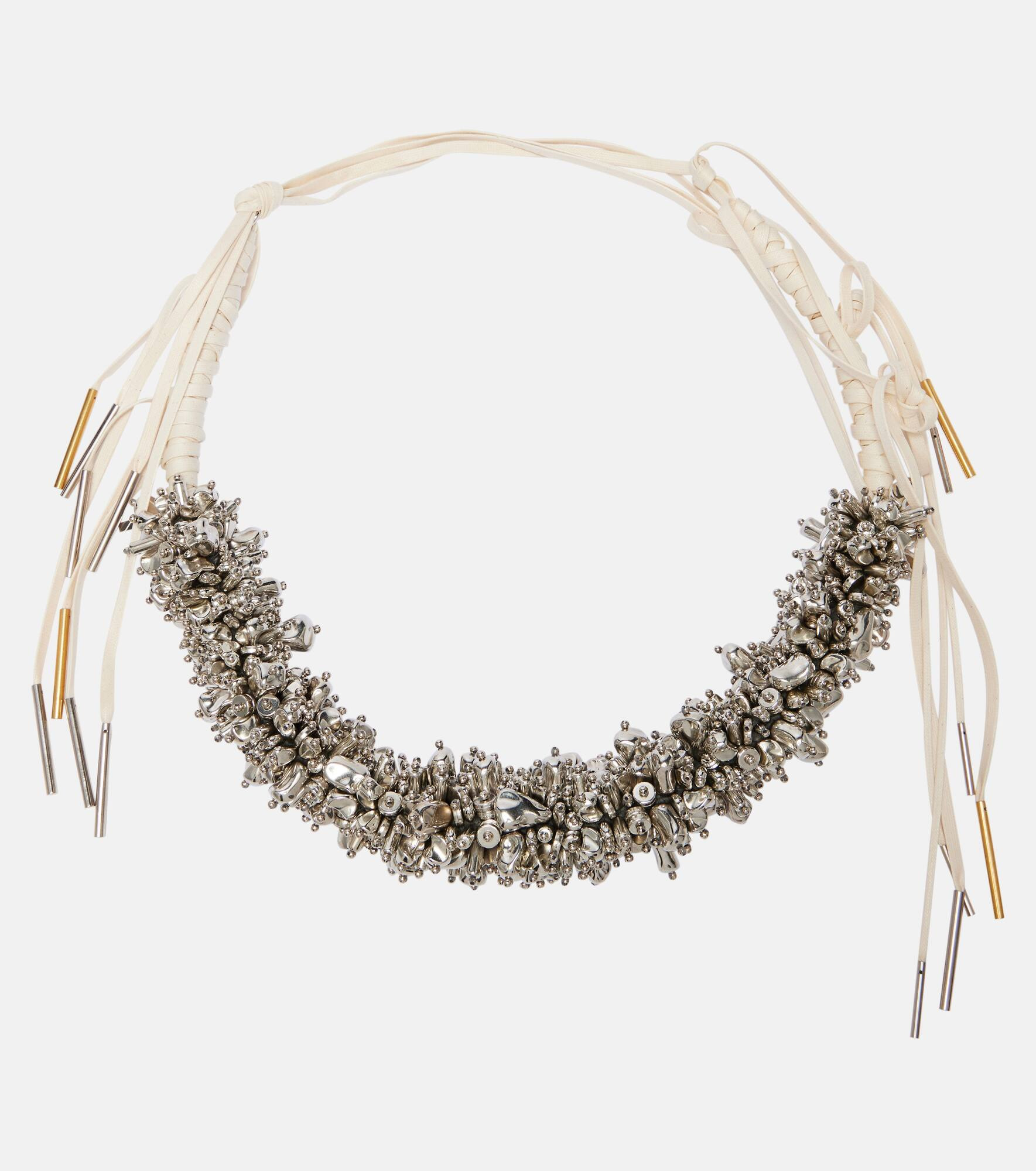 Finish off looks on a bold note with accessories from Dries Van Noten, like this necklace. The chunky design features clusters of silver-toned embellishments and adjustable ties. Product Details - Material: acrylic, cotton, polyester, brass - Made in Italy - Item color: silver, white - Closure: self-ties - Includes: box - Item number: P01097394 Size & Fit - Adjustable length - Max. width 5,5cm-2"