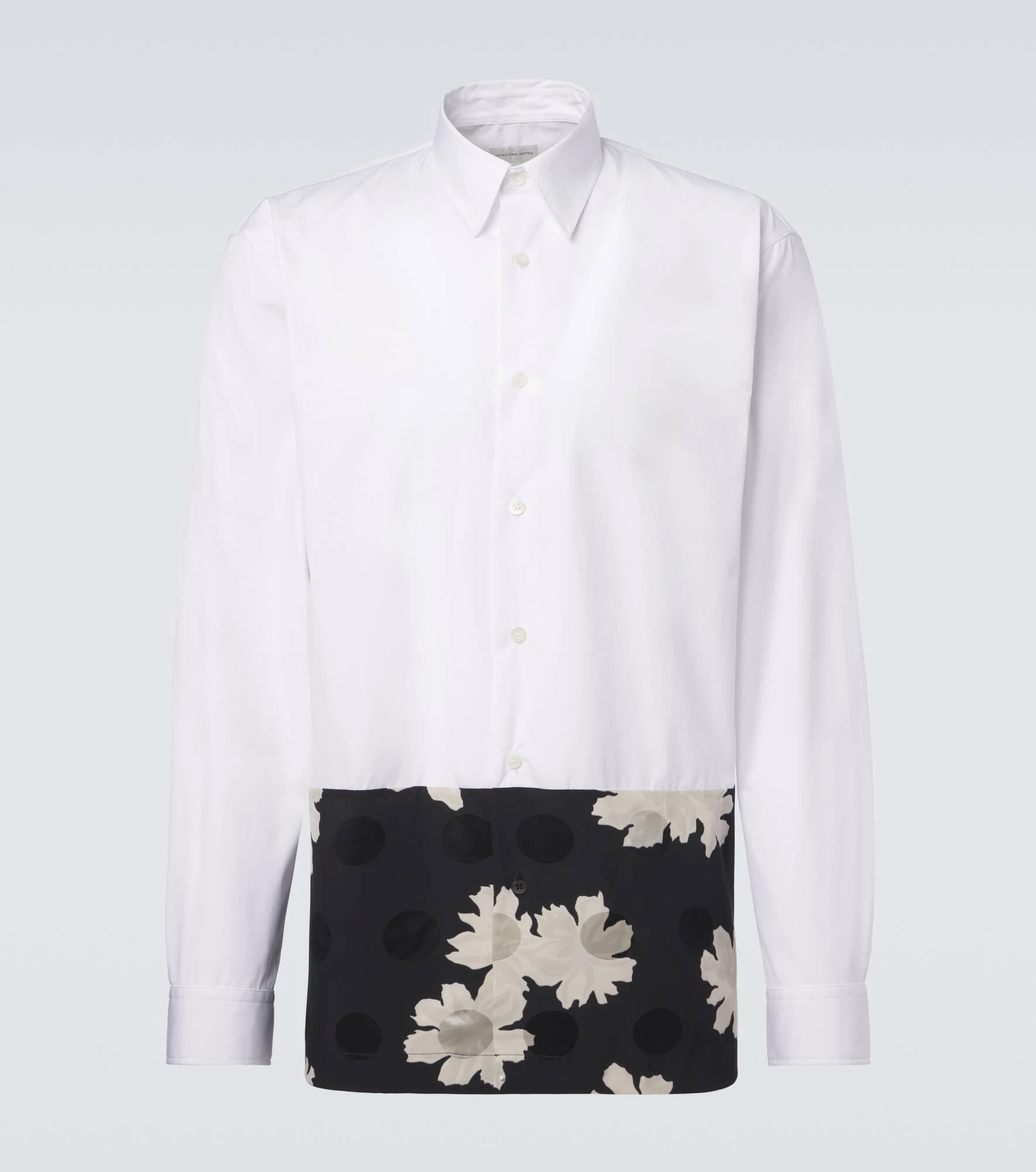 Dries Van Noten's prints are often abstract, overtly maximalist, and always one-of-a-kind. This shirt is cut from cotton-blend poplin to a regular fit, complemented by a contrast floral hem. Product Details - Material: 70% cotton, 30% viscose - Care instructions: machine wash at 30 degrees - Made in Hungary - Color: white - Designer color name: White - Collar: classic (Straight point) - Closure: buttoned front - Cuff: buttoned - Item number: P01135282 Size & Fit - True to size - Without pleats in the back - Designed for a loose fit - Non-stretchy fabric - Falls below the hip - Height of model is 192cm-75.5" and wears a size IT 50