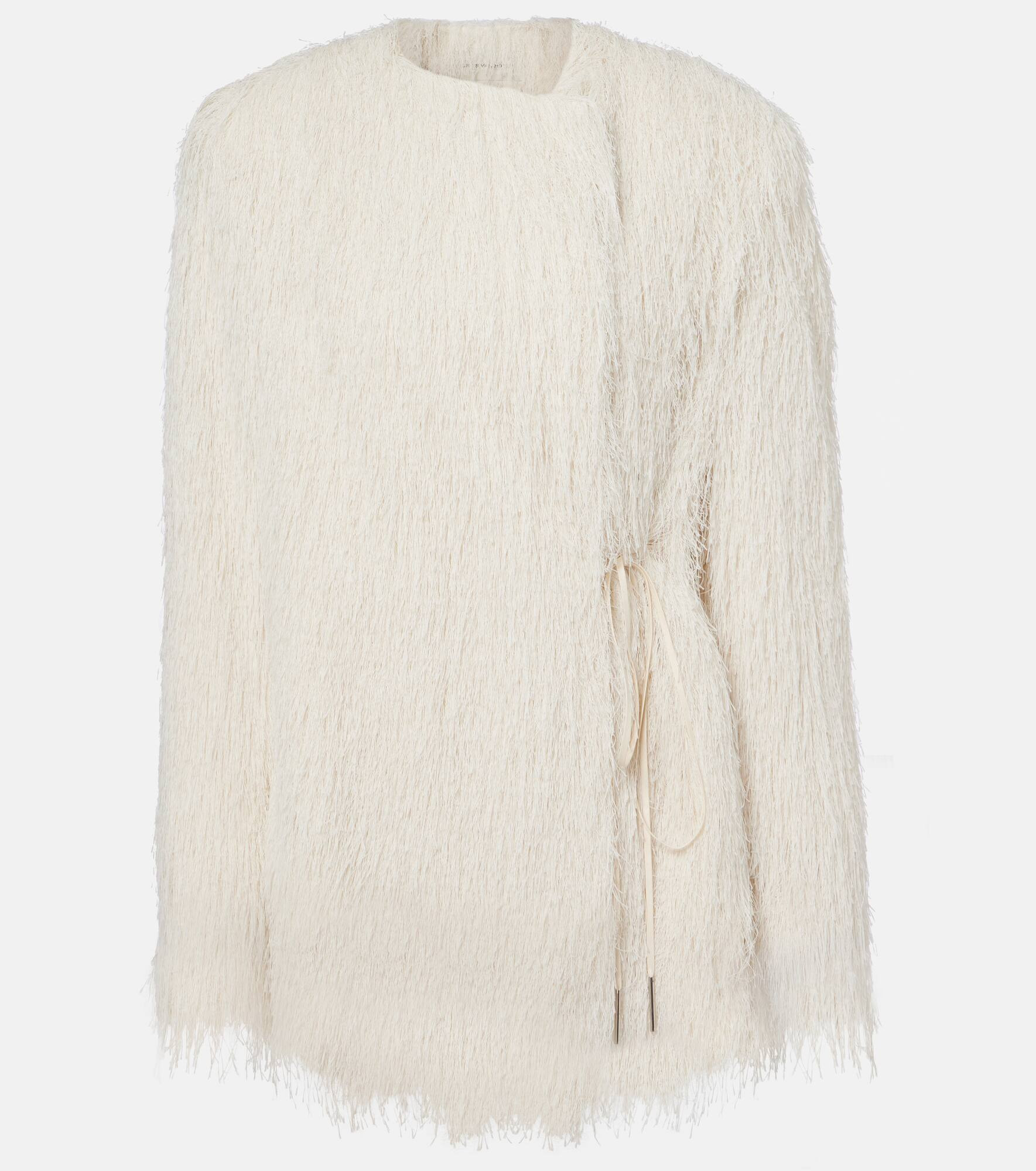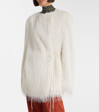 Blending poetic sensibility with intelligent tailoring, Dries Van Noten delivers designs that are unmistakably unique. This collarless jacket is detailed with elegant fringes and finished with a self-tie drawstring closure for a chic, refined touch. Product Details - Material: 100% polyester - Care instructions: dry clean - Made in Poland - Designer color name: White - Item color: white - Lining: 100% viscose - Shoulder pads - Closure: self-ties - Fringed ends - Item number: P01092105 Size & Fit - True to size - Shoulder pad inserts - Loose fit, comes with belt - Non-stretchy fabric - Falls below the hip - The model seen in the picture is 178cm-5'10" and wearing a size XS