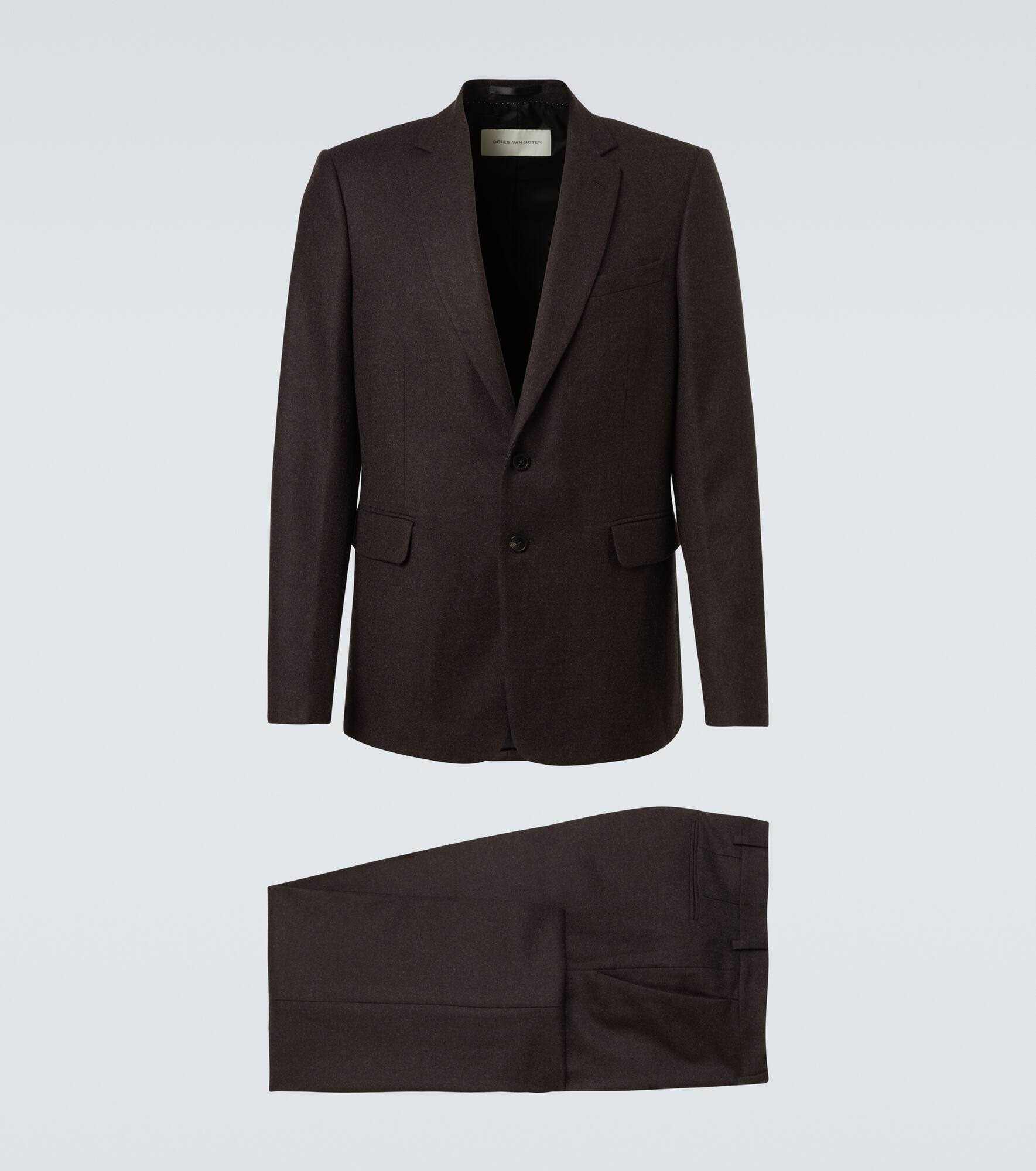 Blending poetic sensibility with precise tailoring, Dries Van Noten delivers unique, modern styles. Crafted from wool, the Kayne suit pairs a blazer with notched lapels, flap pockets and structured shoulders, with single-pleated matching suit pants. Product Details - Material: 100% wool - Care instructions: dry clean - Made in Morocco - Designer color name: Dark Brown - Item color: brown - Lining: 100% cupro - Sleeve lining: 100% viscose - Two-piece set - Closure: single-breasted (two buttons), zip, hook, and button fastening - Notched lapel - Shoulder pads - Pockets: ticket pocket, flap pockets, internal pockets, slant pockets, back pockets - Cuff: four buttons - Belt loops - Fully lined - Single pleat - Hem: unfinished (ready for alteration) - Item number: P01086447 Size & Fit - True to size - Shoulder pad inserts - Regular fit - Non-stretchy fabric - Falls below the hip - Slim-leg - Unhemmed for tailoring - The model in the picture is 185cm-6'1" and wearing a size IT 50