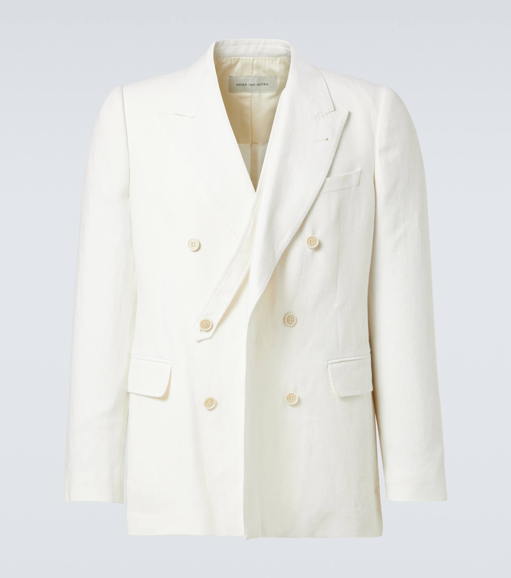 Product Details - Material: 49% linen, 28% wool, 15% silk, 8% cashmere - Care instructions: dry clean - Made in Morocco - Designer color name: Ecr - Closure: double-breasted (six buttons) - Pockets: flap pockets, internal pockets - Lining: 100% cotton - Item number: P01011208 Size & Fit - True to size - Shoulder pad inserts - Regular fit - Non-stretchy fabric - Falls below the hip - Height of model is %cm%cm-%inch%" and wears a size IT 50