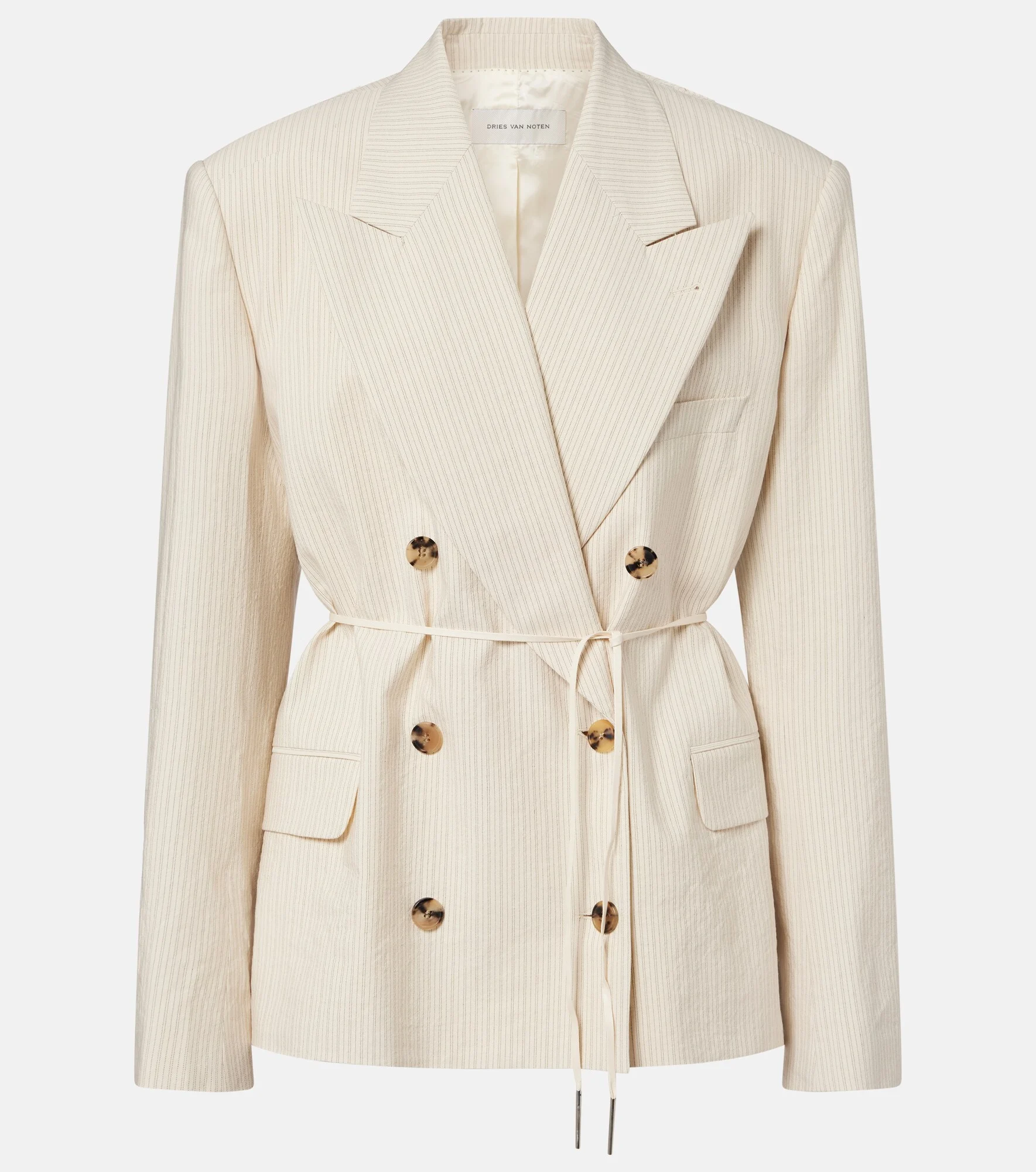 Juxtaposing a poetic sensibility with intelligent tailoring, Dries Van Noten creates styles that are always unique. Crafted from a softly textured cotton blend in a subtle pinstripe weave, this double-breasted blazer features oversized, structured shoulders and a self-tie belt at the waist for effortless shaping. Product Details - Material: 74% cotton, 26% paper yarn - Care instructions: dry clean - Made in Morocco - Color: white - Designer color name: Ecru - Lining: 100% viscose - Shoulder pads - Pockets: flap pockets - Closure: double-breasted (six buttons) - Vent: double - Detachable belt - Item number: P01151239 Size & Fit - Fits large to size - we recommend trying one size smaller - Dropped shoulders - Designed for a loose fit - Non-stretchy fabric - Falls below the hip - The model seen in the picture is 178cm-5'10" and wearing a size XS
