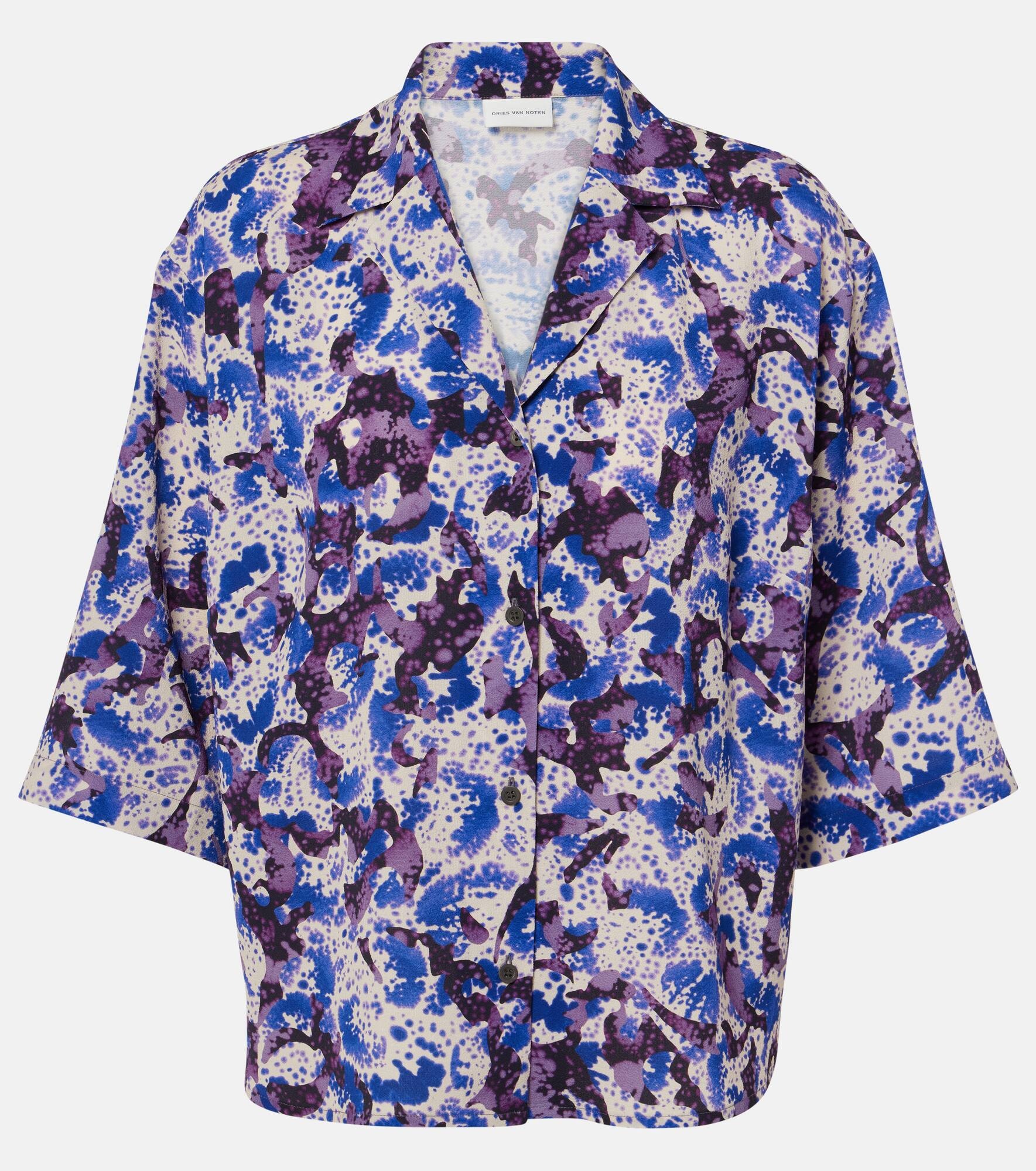Dries Van Noten's prints are often abstract, overtly maximalist, and always one-of-a-kind. One is featured on this shirt, complete with a short-sleeved, boxy silhouette. Product Details - Material: 98% polyester, 2% elastane - Care instructions: machine wash at 30 degrees - Made in Hungary - Designer color name: Blue - Closure: button-down - Item number: P01030325 Size & Fit - True to size - Dropped shoulders - Designed for a loose fit - Non-stretchy fabric - Falls to the hip - The model seen in the picture is 178cm-5'10" and wearing a size FR 36