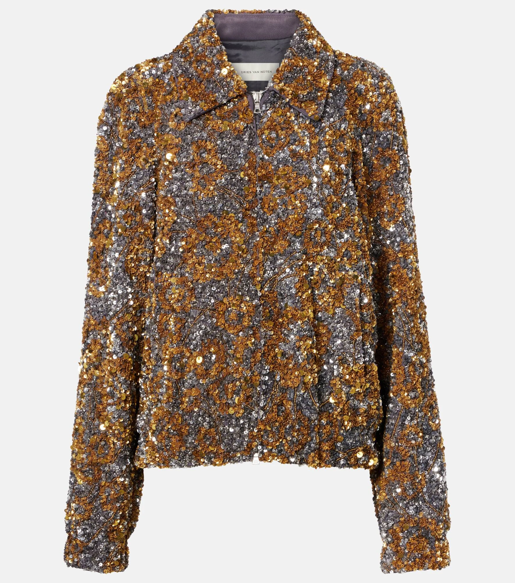 Juxtaposing a poetic sensibility with intelligent tailoring, Dries Van Noten creates styles that are always unique. This blouson jacket is a shimmering design with its all-over sequins in silver and golden hues. Product Details - Material: 100% viscose - Care instructions: dry clean - Made in India - Color: silver - Designer color name: Silver - Lining: 100% viscose - Pockets: side slit pockets - Closure: two-way zipped front - Hem: elasticated - Item number: P01126885 Size & Fit - True to size - Designed for a loose fit - Elasticated hem - Non-stretchy fabric - Falls to the hip - The model seen in the picture is 178cm-5'10" and wearing a size XS