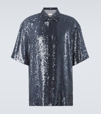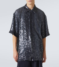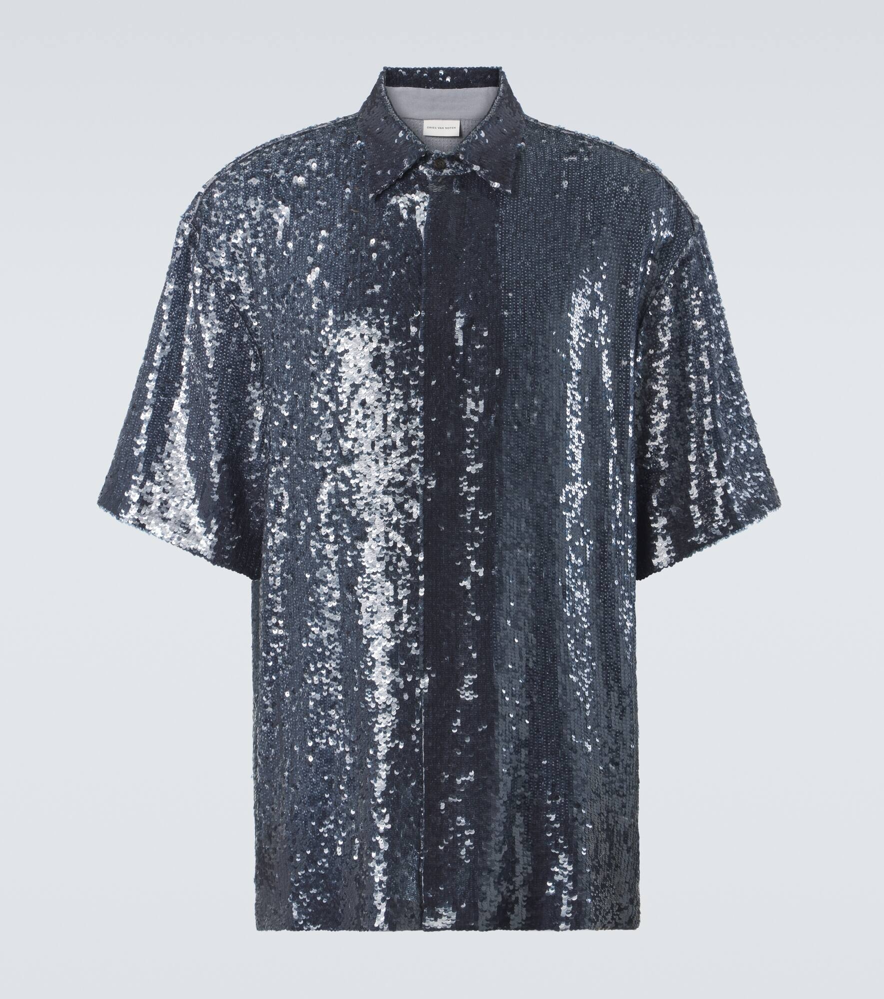 A bold take on a classic style, this all-over sequined shirt from Dries Van Noten is perfect for special occasions. Its relaxed fit is complemented by short sleeves, buttoned front, and a pointed collar. Product Details - Material: 100% viscose - Care instructions: dry clean - Made in India - Designer color name: Navy - Item color: blue - Closure: concealed buttoned front - Item number: P01065431 Size & Fit - True to size - Dropped shoulders - Designed for a loose fit - Non-stretchy fabric - Falls below the hip - Height of model is 190cm-75" and wears a size L