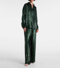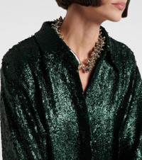 Dries Van Noten's pieces are always maximalist and one-of-a-kind. This shirt is embellished with allover sequins and features a straight, slightly oversized silhouette. Product Details - Material: 100% viscose - Care instructions: dry clean - Made in India - Designer color name: Bottle - Item color: green - Closure: buttoned front - Item number: P01056599 Size & Fit - Fits large to size - we recommend trying one size smaller - Dropped shoulders - Oversized - Non-stretchy fabric - Falls below the hip - The model seen in the picture is 178cm-5'10" and wearing a size FR 34