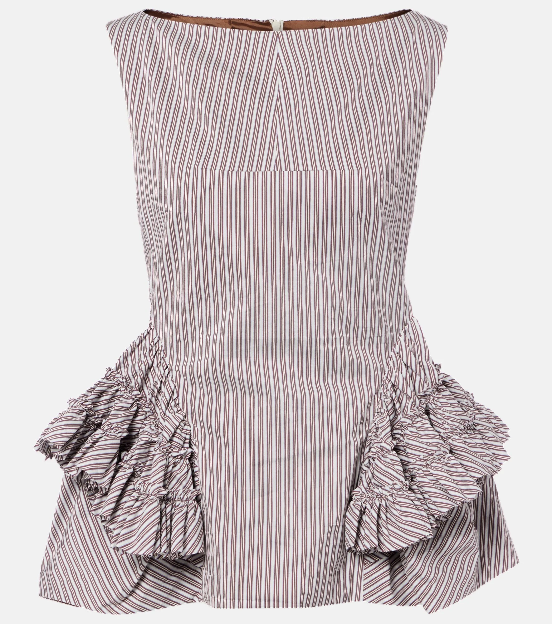 Critically acclaimed Belgian designer Dries Van Noten approaches womenswear with an inimitable, artful perspective. This sleeveless top is crafted from cotton and silk and features a streamlined silhouette with ruffled inserts along the sides that enhance the figure. Product Details - Material: 80% cotton, 20% silk - Care instructions: dry clean - Made in Bulgaria - Color: brown - Designer color name: Brown - Lining: 100% viscose - Closure: concealed zipped back - Item number: P01151830