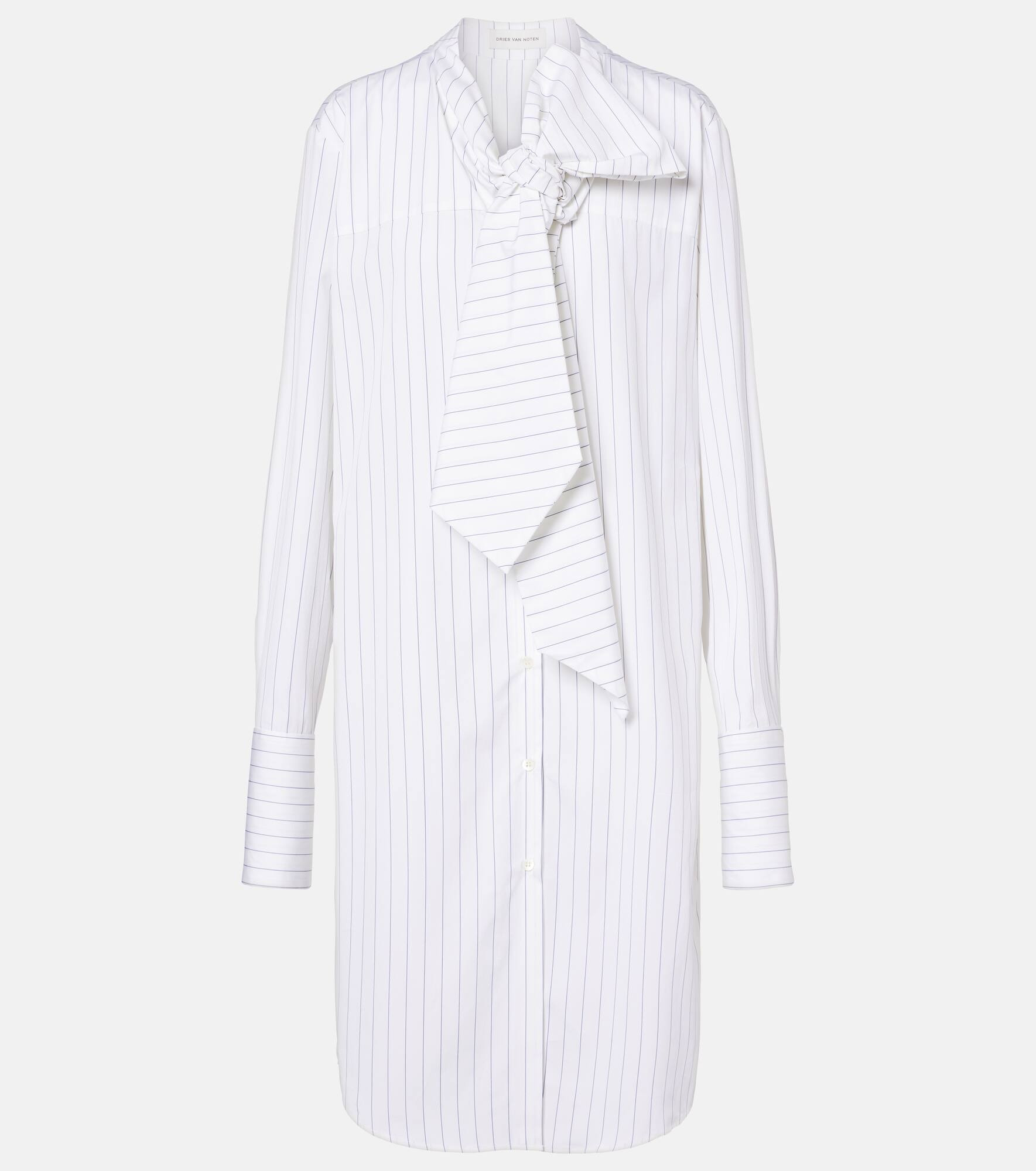 This Dries Van Noten minidress brings refinement to your look with its elegant self-tie neck. The piece is crafted from pure cotton and features a striped motif and a sleek silhouette. Product Details - Material: 100% cotton - Care instructions: machine wash at 30 degrees - Made in Tunisia - Designer color name: Navy - Item color: white - Closure: buttoned placket - Self-tie neck - Cuff: French square - Item number: P01092157 Size & Fit - Fits large to size - we recommend trying one size smaller - Straight fit - Non-stretchy fabric - The model seen in the picture is 178cm-5'10" and wearing a size FR 34