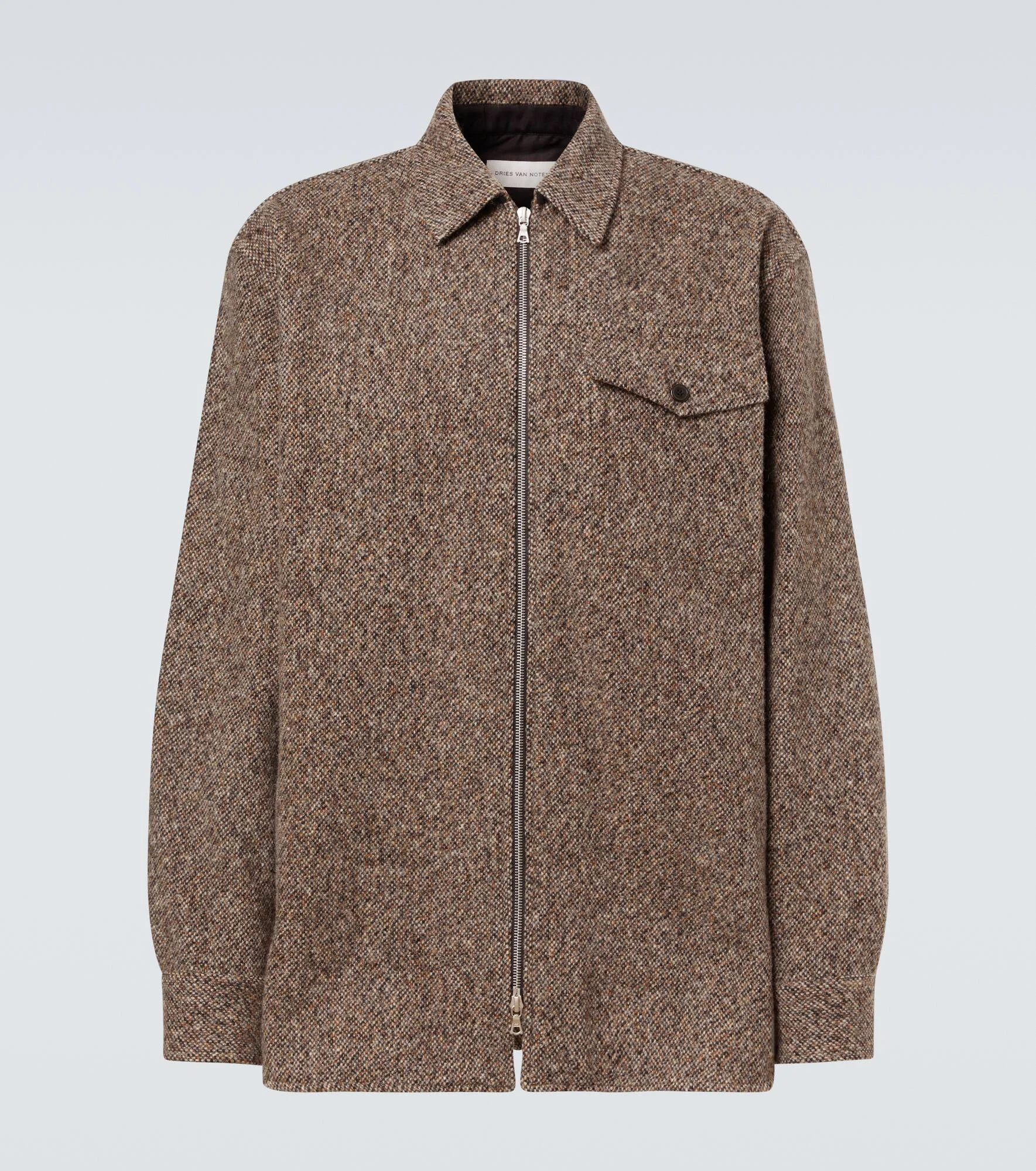Juxtaposing a poetic sensibility with intelligent tailoring, Dries Van Noten creates styles that are always unique. This overshirt is made from a textured wool and cotton-blend tweed. Product Details - Material: 82% wool, 14% cotton, 4% viscose - Care instructions: dry clean - Made in Tunisia - Designer color name: Rust - Item color: gray - Closure: two-way zipped front - Pockets: flap chest pocket - Cuff: buttoned - Item number: P01086456 Size & Fit - True to size - Without pleats in the back - Designed for a loose fit - Non-stretchy fabric - Falls below the hip - Height of model is 189cm-74.5" and wears a size L