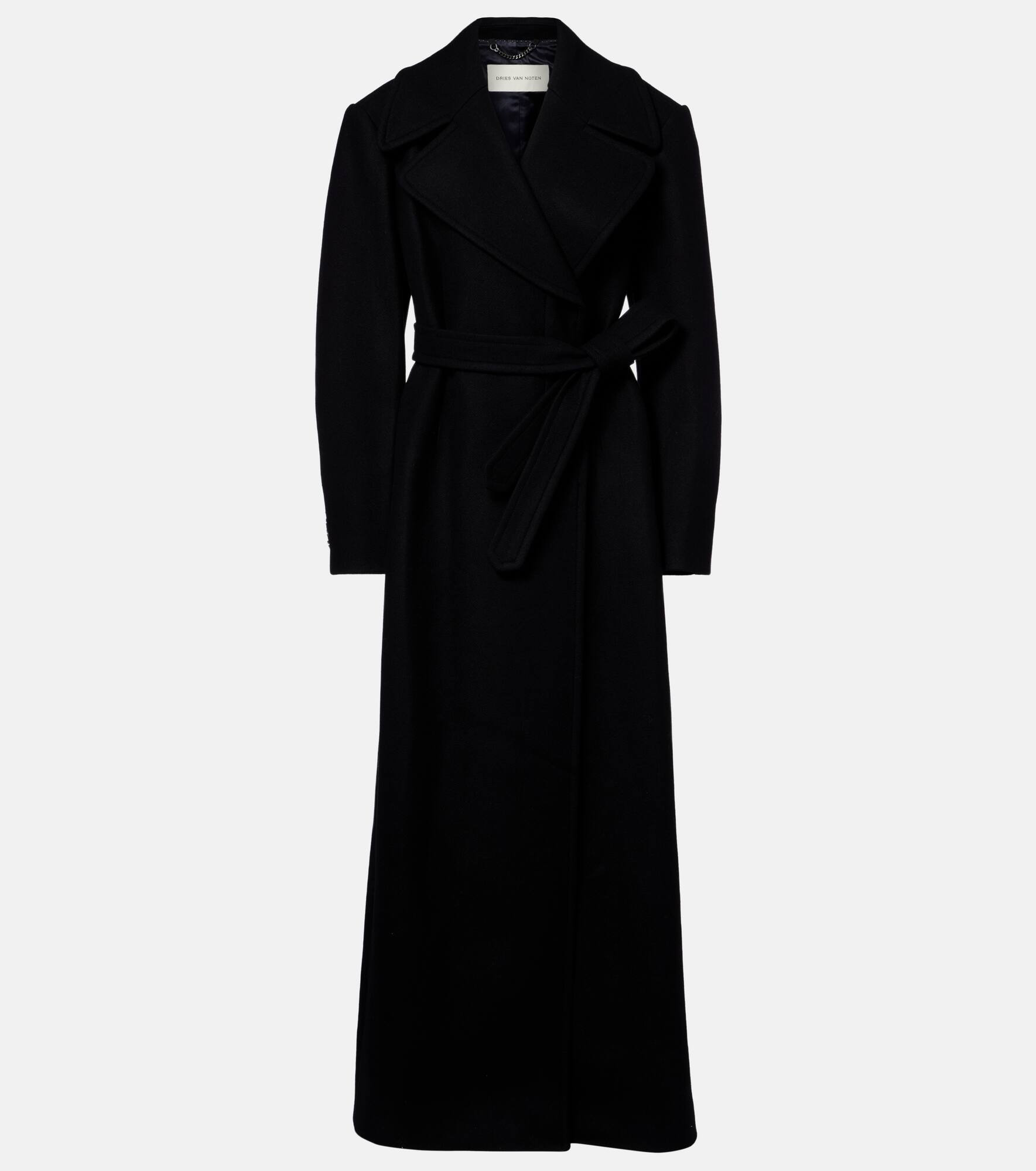 Refine your cold-weather wardrobe with this floor-length Dries Van Noten coat, tailored from a wool-blend twill. The sleek silhouette features structured shoulder pads, peak lapels, side pockets, a self-tie belt, and a concealed button closure. Product Details - Material: 70% wool, 30% polyamide - Care instructions: dry clean - Made in Poland - Designer color name: Black - Item color: black - Lining: 55% cotton, 45% cupro - Sleeve lining: 100% cupro - Closure: concealed buttoned front - Shoulder pads - Pockets: internal pocket, side slit pockets - Cuff: buttoned - Self-tie belt - Vent: single - Item number: P01092100 Size & Fit - Fits large to size - we recommend trying one size smaller - Shoulder pad inserts - Loose fit, comes with belt - Non-stretchy fabric - The model seen in the picture is 178cm-5'10" and wearing a size FR 34