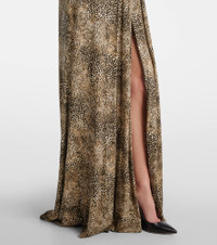 The Animalier jersey gown from Elie Saab features a draped front with a flattering deep V-neckline. The design's long sleeve silhouette is complemented by a floor-length skirt, front slit, and all-over animal-inspired print. Product Details - Material: 93% viscose, 7% elastane - Care instructions: dry clean - Made in Lebanon - Designer color name: Micro Animalier - Item color: brown - Closure: concealed zipper - Item number: P01026808 Size & Fit - True to size - Shoulder pad inserts - Cinched waist - Stretchy fabric - The model seen in the picture is 178cm-5'10" and wearing a size FR 36
