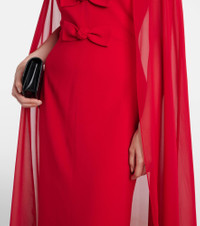 Elie Saab’s impactful designs are proof that the right outfit can make a special occasion all the more memorable. This silk-blend gown features a V-neckline adorned with tonal bows and a caped silhouette that flows into an ethereal back train. Product Details - Material: 66% silk, 18% viscose, 15% acetate, 1% elastane - Care instructions: dry clean - Made in Lebanon - Designer color name: Sunset Blaze - Item color: red - Lining: 100% silk - Collar: V-neck - Closure: zipped back - Item number: P01090453 Size & Fit - Fits large to size - we recommend trying one size smaller - Close fit at the hips - Low back - Fitted - Loose outer layer - Non-stretchy fabric - The model seen in the picture is 178cm-5'10" and wearing a size FR 34