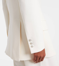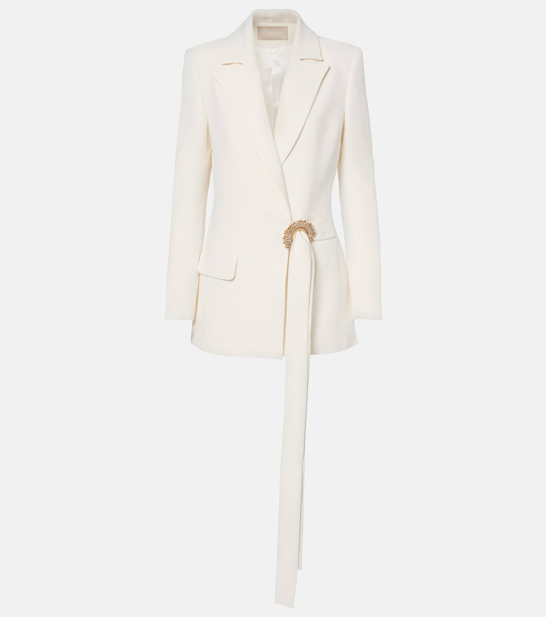Elie Saab’s impactful designs are proof that the right outfit can make a special occasion all the more memorable. The blazer has a buttoned front and a self-tie that wraps through an embellished hoop. Product Details - Material: 35% cupro, 32% viscose, 30% acetate, 3% elastane - Care instructions: dry clean - Made in Lebanon - Designer color name: Powder White - Item color: white - Lining: 100% cupro - Fully lined - Collar: notch neck - Closure: buttoned front, self-ties - Attached belt - Item number: P01061110 Size & Fit - True to size - Shoulder pad inserts - Loose fit, comes with belt - Non-stretchy fabric - Falls below the hip - The model seen in the picture is 178cm-5'10" and wearing a size FR 36