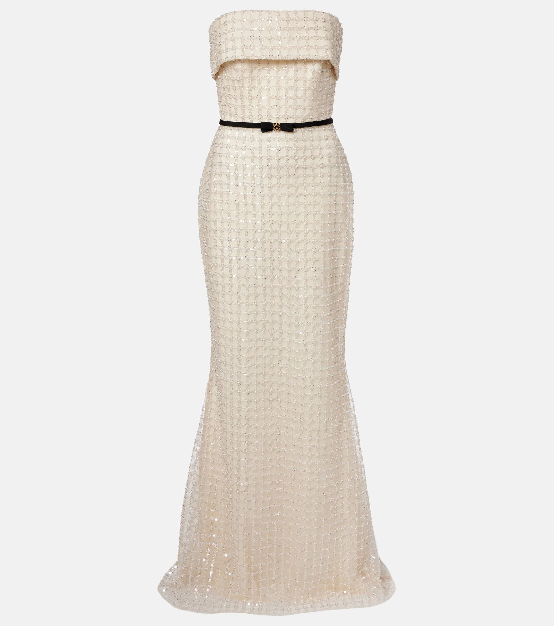 Elie Saab’s impactful designs are proof that the right outfit can make a special occasion all the more memorable. Carefully crafted from silk-blend fabric, this gown is a floor-sweeping piece characterized by its all-over embellishments and strapless bustier bodice. Product Details - Material: 51% silk, 35% polyester, 7% cotton, 7% viscose - Care instructions: dry clean - Made in Lebanon - Color: white - Designer color name: Whisper White - Lining: 100% silk - Boning - Closure: concealed zipped back - Item number: P01127531 Size & Fit - True to size - Strapless - Internal boned corset for support - Fitted - Non-stretchy fabric - The model seen in the picture is 178cm-5'10" and wearing a size FR 36
