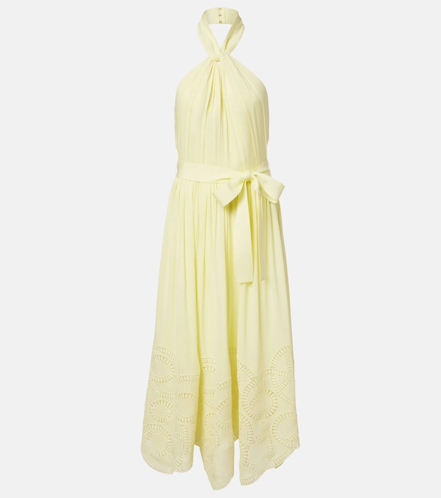 Elie Saab’s impactful designs are proof that the right outfit can make a special occasion all the more memorable. Carefully crafted from silk-blend fabric, this midi dress features a halter neckline, a self-tie waistline, and lace detailing bordering the hemline. Product Details - Material: 53% silk, 47% polyester - Care instructions: dry clean - Made in Lebanon - Color: yellow - Designer color name: Butter Yellow - Lining: 100% silk - Closure: concealed zipped back - Detachable belt - Item number: P01127536 Size & Fit - True to size - Low back - Cinched waist - Adjustable at the waist - Non-stretchy fabric - The model seen in the picture is 178cm-5'10" and wearing a size FR 36
