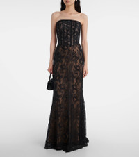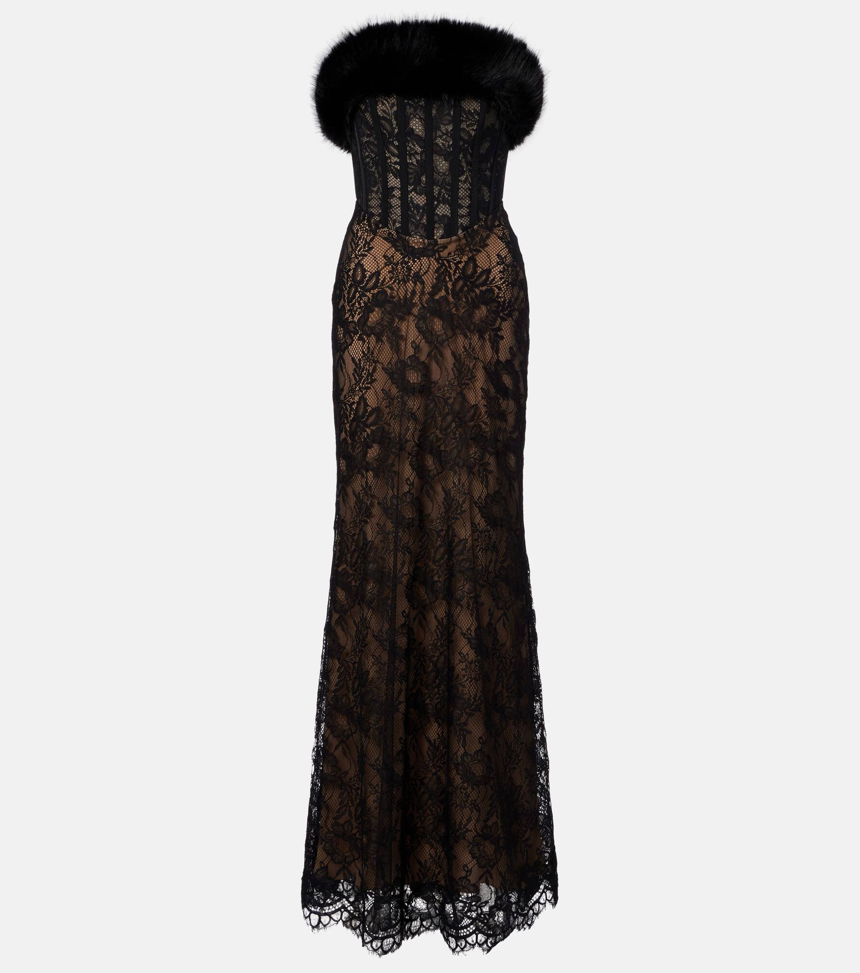 Elie Saab’s impactful designs are proof that the right outfit can make a special occasion all the more memorable. This strapless gown is adorned with delicate lace embroidery and finished with a plush-trimmed bodice for an elegant touch. Product Details - Material: 38% cotton, 28% silk, 22% viscose, 11% polyamide, 1% polyester - Care instructions: dry clean - Made in Lebanon - Designer color name: Black - Item color: black - Lining: 100% silk - Detachable trim - Boning - Closure: concealed zipped back - Material II: 100% polyester - Item number: P01090455 Size & Fit - True to size - Strapless - Internal boned corset for support - Fitted - Non-stretchy fabric - The model seen in the picture is 178cm-5'10" and wearing a size FR 36