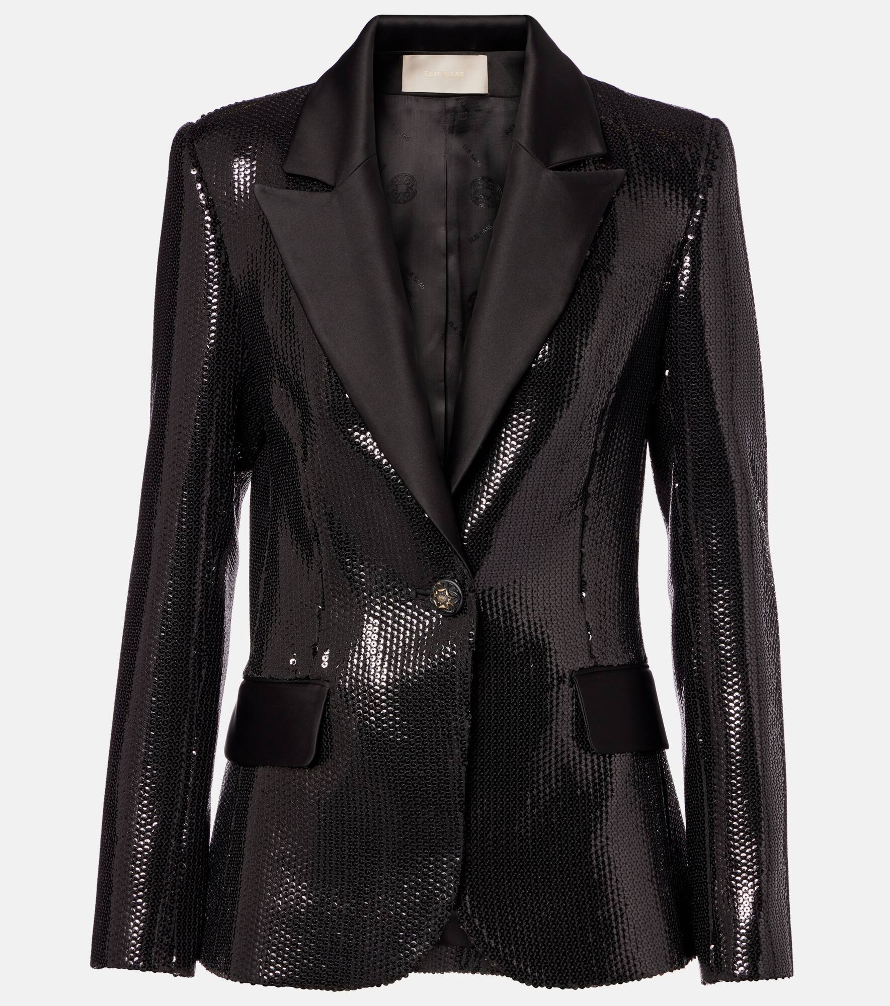 Elie Saab’s impactful designs are proof that the right outfit can make a special occasion all the more memorable. This blazer is crafted from lustrous satin and stands out with dazzling sequin embellishments throughout. Product Details - Material: 45% polyester, 40% viscose, 15% elastane - Care instructions: dry clean - Made in Lebanon - Designer color name: Black - Item color: black - Lining: 100% viscose - Contrast lapel - Cuff: three buttons - Pockets: flap pockets - Closure: single-breasted (one button) - Vent: double - Item number: P01090487 Size & Fit - True to size - Shoulder pad inserts - Cinched waist - Non-stretchy fabric - Falls below the hip - slit length 20cm-8" - The model seen in the picture is 178cm-5'10" and wearing a size FR 36