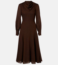 At once polished and pared-back, Emilia Wickstead proves that simple, well-executed silhouettes will stand out. Made from soft wool twill, the Avara midi dress features a flared, voluminous skirt and gentle draping at the neckline. Product Details - Material: 100% wool - Care instructions: dry clean - Made in the UK - Designer color name: Cinnamon - Item color: brown - Lining: 100% polyester - Collar: cowl neck - Cuff: buttoned - Closure: concealed zipped back - Item number: P01070411 Size & Fit - Fits large to size - we recommend trying one size smaller - Cinched waist - Non-stretchy fabric - The model seen in the picture is 178cm-5'10" and wearing a size UK 6