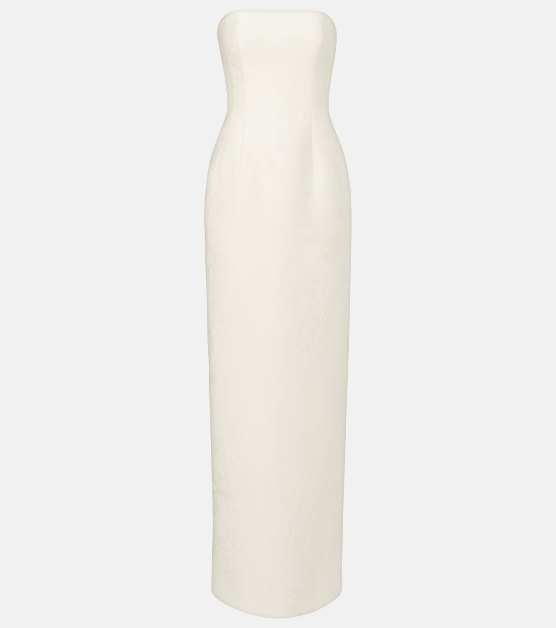 Crafted for unforgettable moments, the Laelia bridal gown from Emilia Wickstead blends classic charm with modern sophistication. The design features a strapless bodice and a sheath silhouette that gently flatters the figure. Product Details - Material: 90% polyester, 10% silk - Care instructions: dry clean - Made in the UK - Designer color name: Ivory - Item color: white - Lining: 100% polyester - Closure: concealed zipper, zipped back, hook fastening - Boning - Long vent - Item number: P01051520 Size & Fit - True to size - Strapless - Internal boned corset for support - Cinched waist - Non-stretchy fabric - slit length 66cm-26" - The model seen in the picture is 178cm-5'10" and wearing a size UK 8