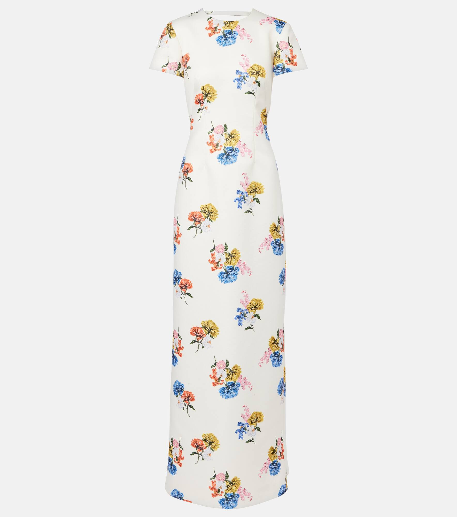 The Fosette floral maxi dress has all the romance and refinement the Emilia Wickstead is best known for. It's simple front is offset by a slightly open back and a back pleated panel. Product Details - Material: 100% polyester - Care instructions: dry clean - Made in China - Designer color name: Retro Bouquet On White - Item color: multicolor - Sleeves: short-sleeved - Collar: crewneck - Closure: zipped back, buttoned back - Floral - Hem: straight - Item number: P01051582 Size & Fit - True to size - Fitted - Non-stretchy fabric - The model seen in the picture is 178cm-5'10" and wearing a size UK 8
