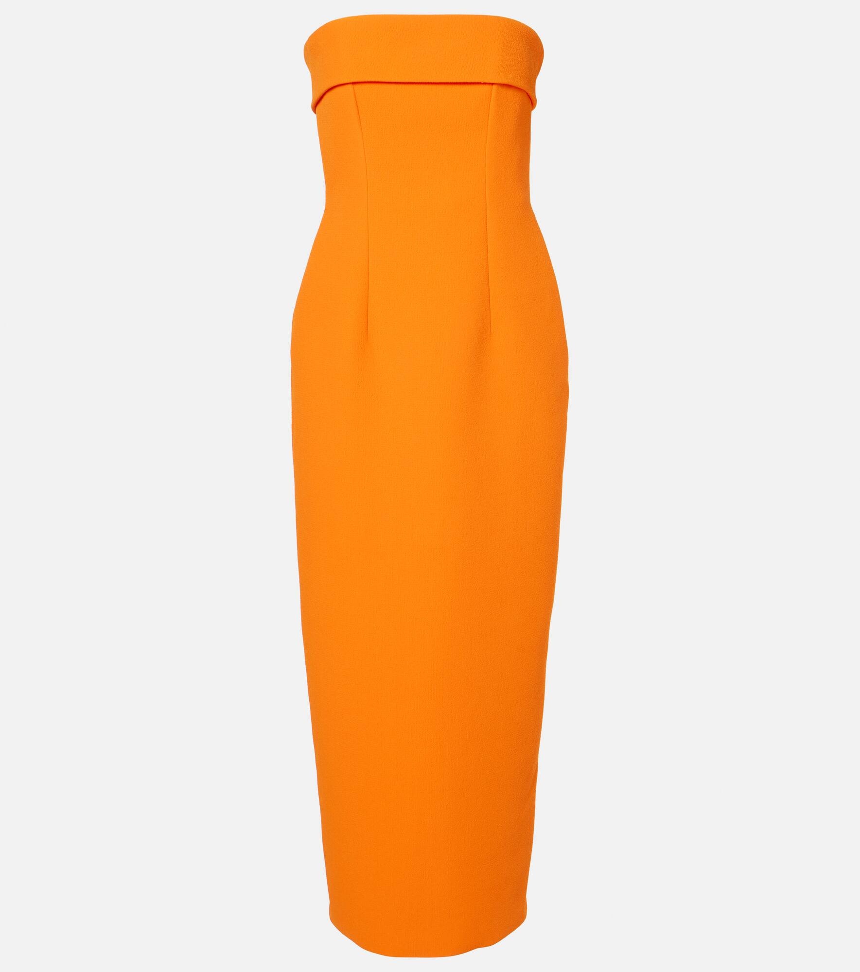 Product Details - Material: 95% polyester, 5% elastane - Care instructions: dry clean - Made in the UK - Designer color name: Hot Orange - Closure: zipped back - Lining: 100% polyester - Item number: P00951607 Size & Fit - True to size - Strapless - Internal boned corset for support - Cinched waist - Non-stretchy fabric - slit length 42cm-16.5" - The model seen in the picture is 178cm-5'10" and wearing a size UK 8