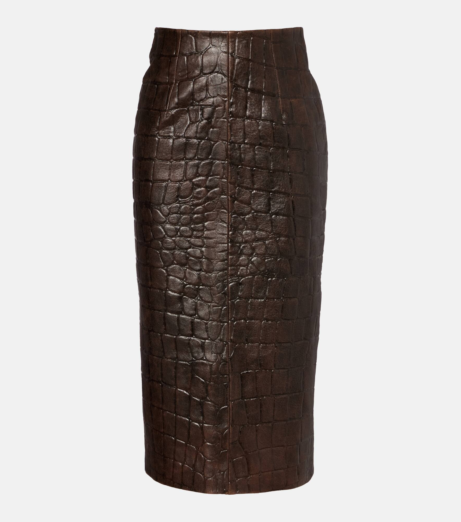 At once polished and pared-back, Emilia Wickstead proves that simple, well-executed silhouettes will stand out. Crafted from leather, the Loretta midi skirt is tailored to a pencil silhouette with a high-rise waistline and a croc-effect finish. Product Details - Material: 100% sheep leather - Care instructions: specialist clean - Made in the UK - Designer color name: Coco Embossed King Croc - Item color: brown - Lining: 100% viscose - Contains non-textile parts of animal origin - Hardware color: bronze - Closure: concealed zipped back - Short vent - Item number: P01070396 Size & Fit - True to size - Non-stretchy fabric - The model seen in the picture is 178cm-5'10" and wearing a size UK 8
