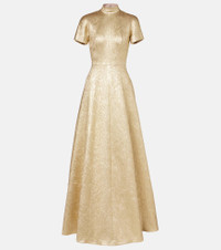 Steal the spotlight in the Malinda gown by Emilia Wickstead. Crafted from shimmering metallic cloque, this standout piece is designed with an elegant mock neck, side pockets, and a delicate zip closure at the back. Product Details - Material: 57% polyester, 35% metallic fibres, 8% polyamide - Care instructions: dry clean - Made in the UK - Designer color name: Gold - Item color: gold - Collar: mockneck - Closure: zipped back - Pockets: side slit pockets - Fully lined - Item number: P01051521 Size & Fit - True to size - Cinched waist - Non-stretchy fabric - The model seen in the picture is 178cm-5'10" and wearing a size UK 8