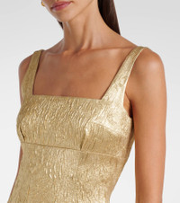 Made for the spotlight, the Micheline gown by Emilia Wickstead is crafted from shimmering metallic cloque. Cut to a sophisticated column shape, this floor-length dress features an elegant square neckline. Product Details - Material: 57% polyester, 35% metallic fibres, 8% polyamide - Care instructions: dry clean - Made in the UK - Designer color name: Gold - Item color: gold - Lining: 100% polyester - Closure: zipped back - Long vent - Fully lined - Item number: P01051512 Size & Fit - Fits large to size - we recommend trying one size smaller - Low back - Cinched waist - Non-stretchy fabric - slit length 65,0cm-25.5" - The model seen in the picture is 178cm-5'10" and wearing a size UK 6
