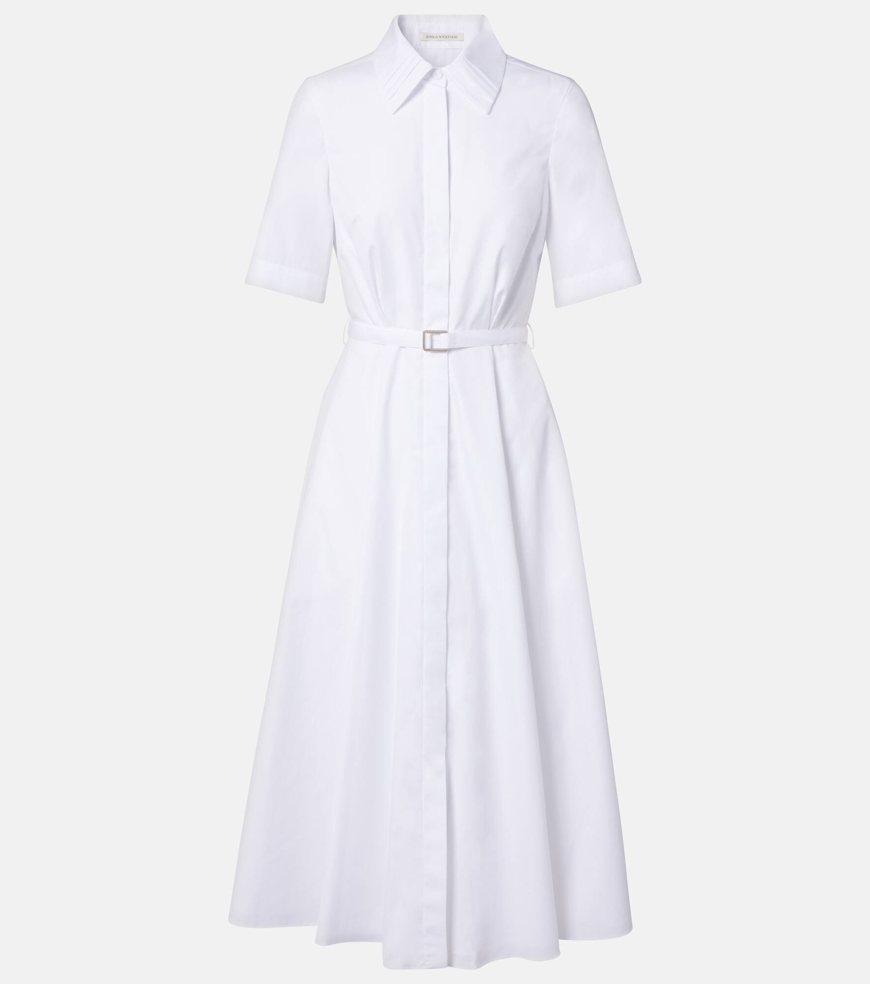 Crafted from pure cotton, the Rubie shirt dress from Emilia Wickstead features a midi length and a belt to cinch the waist. This design utilizes a concealed buttoned front for closure. Product Details - Material: 100% cotton - Care instructions: dry clean - Made in Portugal - Designer color name: White - Item color: white - Lining: 100% cotton - Closure: concealed buttoned front - Collar: classic (Straight point) - Attached belt - Item number: P01051628 Size & Fit - True to size - Cinched waist - Non-stretchy fabric - The model seen in the picture is 178cm-5'10" and wearing a size UK 8