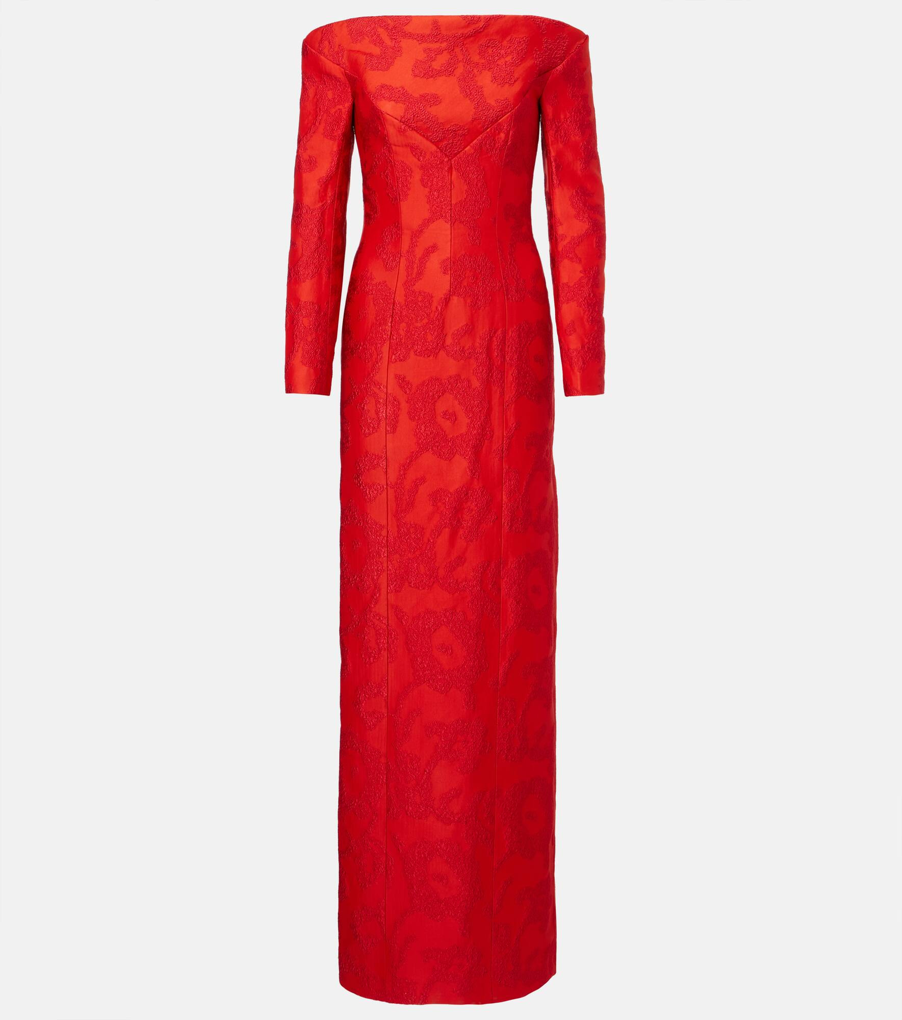 Turn to Emilia Wickstead for unforgettable garments that will make a striking impression at your next event. The Zarith boucle maxi dress features a delicate jacquard pattern and is finished with an off-shoulder neckline and a back slit. Product Details - Material: 44% polyamide, 42% polyester, 14% silk - Care instructions: dry clean - Made in the UK - Designer color name: Red - Item color: red - Lining: 73% acetate, 27% silk - Cuff: zipped - Closure: concealed zipper, zipped back, hook-fastening back - Long vent - Item number: P01070421 Size & Fit - True to size - Off-the-shoulder - Internal boned corset for support - Cinched waist - Non-stretchy fabric - slit length 66cm-26" - The model seen in the picture is 178cm-5'10" and wearing a size UK 8