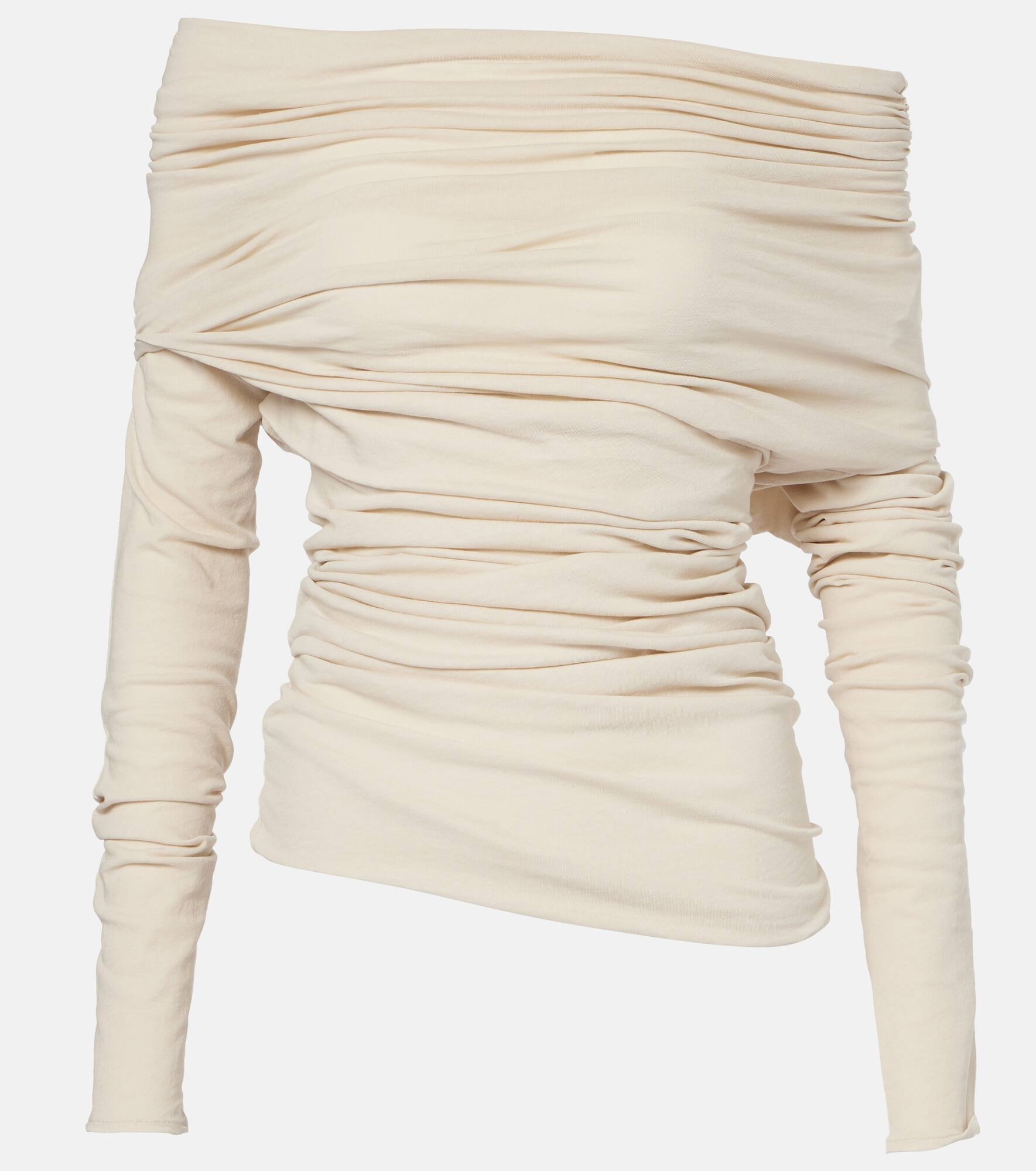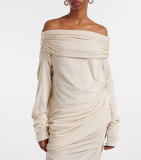 Product Details - Material: 94% cotton, 6% elastane - Care instructions: machine wash at 30 degrees - Made in China - Designer color name: Stone - Sleeves: long-sleeved - Item number: P01020256 Size & Fit - True to size - Extra-long sleeves - Off-the-shoulder - Fitted - Stretchy fabric - Falls below the hip - The model seen in the picture is 178cm-5'10" and wearing a size XS